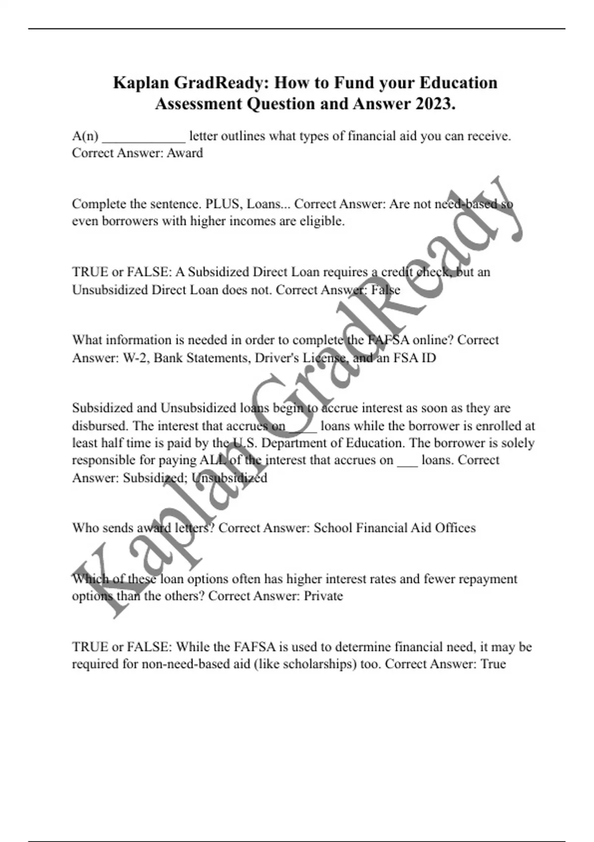 Kaplan GradReady: How to Fund your Education Assessment Question and Answer 2023. A(n) ____________ letter outlines what types of financial aid you can receive. Correct Answer: Award Complete the sentence. PLUS, Loans... Correct Answer: Are not need-based so even borrowers with higher incomes are eligible. TRUE or FALSE: A Subsidized Direct Loan requires a credit check, but an Unsubsidized Direct Loan does not. Correct Answer: False What information is needed in order to complete the FAFSA online? Correct Answer: W-2, Bank Statements, Driver's License, and an FSA ID Subsidized and Unsubsidized loans begin to accrue interest as soon as they are disbursed. The interest that accrues on ____ loans while the borrower is enrolled at least half time is paid by the U.S. Department of Education. The borrower is solely responsible for paying ALL of the interest that accrues on ___ loans. Correct Answer: Subsidized; Unsubsidized Who sends award letters? Correct Answer: School Financial Aid Offices Which of these loan options often has higher interest rates and fewer repayment options than the others? Correct Answer: Private TRUE or FALSE: While the FAFSA is used to determine financial need, it may be required for non-need-based aid (like scholarships) too. Correct Answer: True
