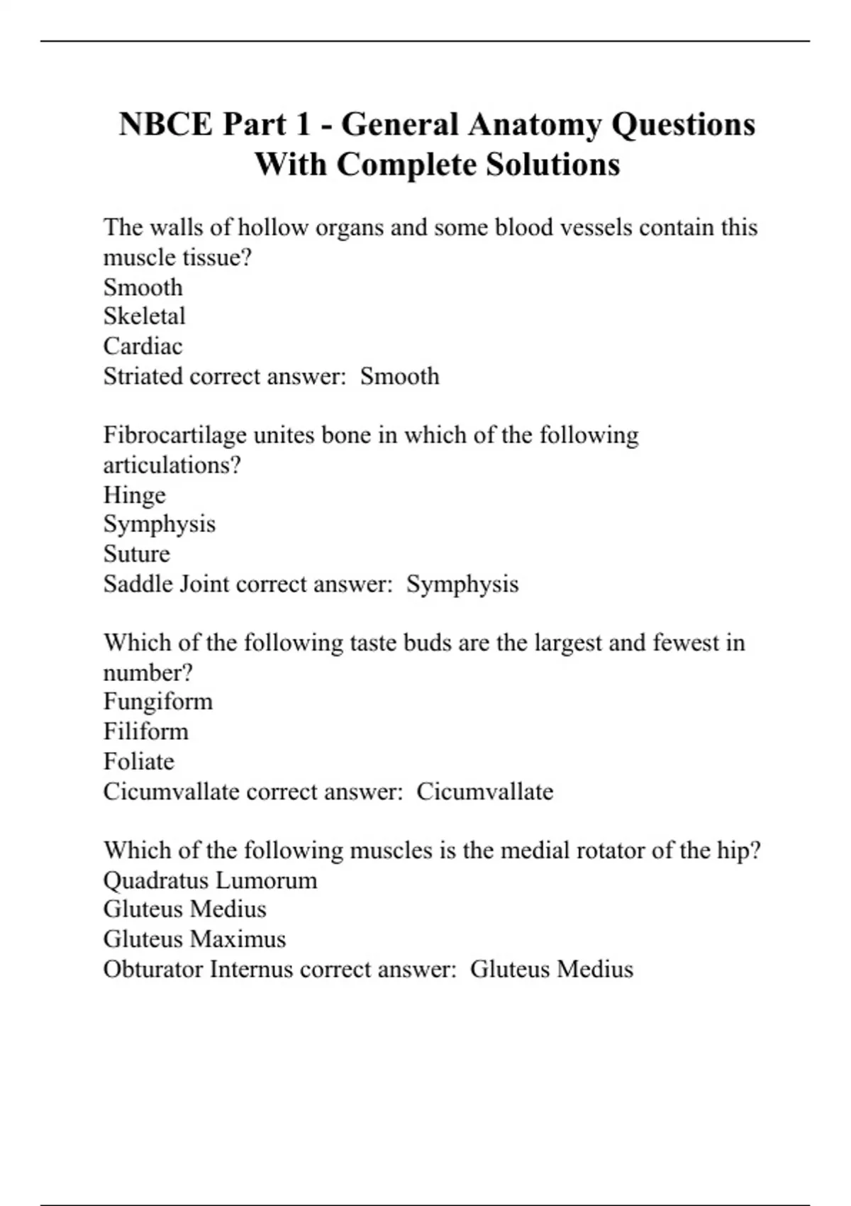The walls of hollow organs and some blood vessels contain this muscle tissue? Smooth Skeletal Cardiac Striated correct answer: Smooth Fibrocartilage unites bone in which of the following articulations? Hinge Symphysis Suture Saddle Joint correct answer: Symphysis Which of the following taste buds are the largest and fewest in number? Fungiform Filiform Foliate Cicumvallate correct answer: Cicumvallate Which of the following muscles is the medial rotator of the hip? Quadratus Lumorum Gluteus Medius Gluteus Maximus Obturator Internus correct answer: Gluteus Medius Which passes thru the fora