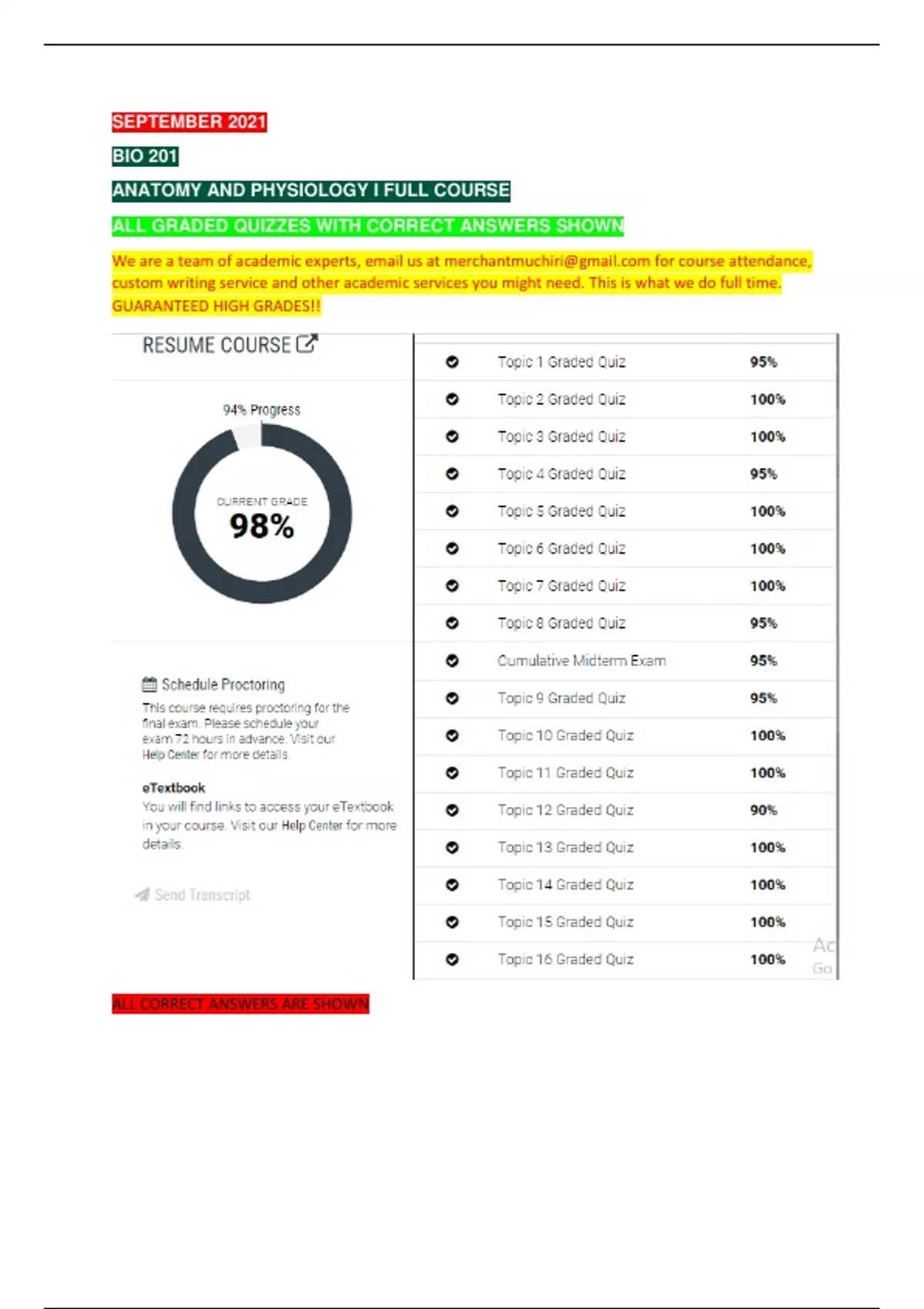 this is BIO 201 ANATOMY AND PHYSIOLOGY I FULL COURSE ALL GRADED QUIZZES WITH CORRECT ANSWERS SHOWN click for instant download