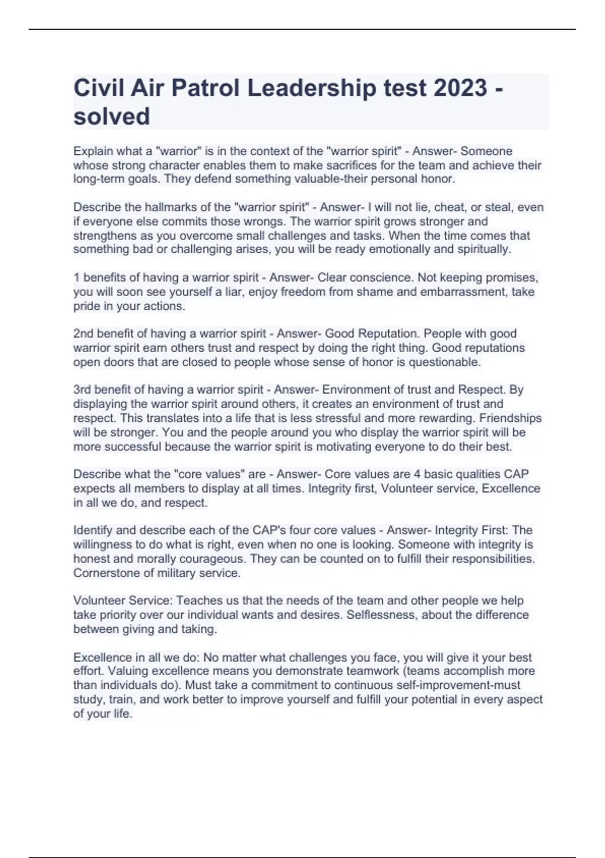 Explain what a "warrior" is in the context of the "warrior spirit" - Answer- Someone whose strong character enables them to make sacrifices for the team and achieve their long-term goals. They defend something valuable-their personal honor. Describe the hallmarks of the "warrior spirit" - Answer- I will not lie, cheat, or steal, even if everyone else commits those wrongs. The warrior spirit grows stronger and strengthens as you overcome small challenges and tasks. When the time comes that something bad or challenging arises, you will be ready emotionally and spiritually. 1 benefits of having a warrior spirit - Answer- Clear conscience. Not keeping promises, you will soon see yourself a liar, enjoy freedom from shame and embarrassment, take pride in your actions. 2nd benefit of having a warrior spirit - Answer- Good Reputation. People with good warrior spirit earn others trust and respect by doing the right thing. Good reputations open doors that are closed to people whose sense of honor is questionable. 3rd benefit of having a warrior spirit - Answer- Environment of trust and Respect. By displaying the warrior spirit around others, it creates an environment of trust and respect. This translates into a life that is less stressful and more rewarding. Friendships will be stronger. You and the people around you who display the warrior spirit will be more successful because the warrior spirit is motivating everyone to do their best. Describe what the "core values" are - Answer- Core values are 4 basic qualities CAP expects all members to display at all times. Integrity first, Volunteer service, Excellence in all we do, and respect. Identify and describe each of the CAP's four core values - Answer- Integrity First: The willingness to do what is right, even when no one is looking. Someone with integrity is honest and morally courageous. They can be counted on to fulfill their responsibilities. Cornerstone of military service. Volunteer Service: Teaches us that the needs of the team and other people we help take priority over our individual wants and desires. Selflessness, about the difference between giving and taking. Excellence in all we do: No matter what challenges you face, you will give it your best effort. Valuing excellence means you demonstrate teamwork (teams accomplish more than individuals do). Must take a commitment to continuous self-improvement-must study, train, and work better to improve yourself and fulfill your potential in every aspect of your life. Respect: Defend human dignity. Treats others as they would like to be treated. They understand that each individual is unique and accepts them for who they are, in spirit of tolerance. Defend the idea that a cadet's character ought to be held to a high standard - Answer- The cadet's character is very important. Holding a high standard of a cadet's character shows to others that the respectful and proper way of presenting ones self of character should be exemplified on a regular basis. The cadet's character should follow the warrior spirit and four core values. Holding these characteristics to a high standard shows others that it is very important to follow these characteristics. Enforcing the proper characteristics shows and tells the other cadets who are newer that they must follow these guide lines of the characteristics they must poses. It does not just show respect to others, but to yourself and builds your other characteristics such as leadership. In the future, these characteristics can come to impress others and have good benefits. Describe the concept of self-awareness - Answer- To know how well you are living up to the ideals of the core values requires self-awareness, the ability to monitor and judge your own actions. Genuine self-awareness requires incredible honesty. A self-aware leader understands their personal strengths and weaknesses, and habitually takes stock in their actions. Describe the concept of self-discipline and explain what you can do to develop it. - Answer- A person who follows their instructions of their teacher. All about following the right instructions so that you achieve the right goals. Self-discipline is basically the ability to direct your thoughts, emotions, and actions toward a meaningful purpose. Self-discipline is willpower. It is a deep sense of commitment. How to develop: strengthen your work habits- try to do something that is necessary but not fun. search for challenges. Describe the concept of attitude and explain why attitudes are contagious - Answer- The state of mind that lies behind your every action. Someone who has a negative attitude would have a world full of problems and nothing ever goes right. Someone with a positive attitude can control their thoughts and feelings rather than allow negativity to imprison them. Even though attitude is something that exists in your head it is still something that can be visible to the people around you. Things such as facial expressions, gestures, posture, tone of voice reveal your attitude around others. The care you put into your uniform, tests, studying, class participation shows your overall quality of work. All attitudes, good and bad can be contagious. the example of home field advantage is one of them. How to develop a positive attitude - Answer- A positive attitude begins in the realization that attitude is a choice. You can choose to be positive, or you can choose to be negative. Arise from understanding. If you understand the reason for drill or wearing a uniform or any other aspect of cadet life, CAP's rules and standards will be more meaningful. Look for the good in every situation. A positive attitude will carry you through life's challenges. Explain what an oath is - Answer- An oath is a solemn promise. A promise that serves as a public good. When you swear an oath, you put your personal honor and reputation on the line. The oath symbolizes how serious cadets are about becoming a leader. Recite the Cadet Oath from memory - Answ
