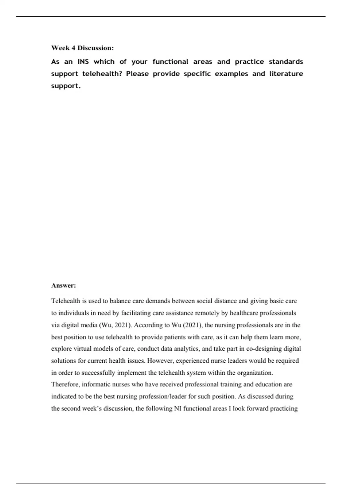 Week 4 Discussion: As an INS which of your functional areas and practice standardssupporttelehealth?Pleaseprovidespecificexamplesandliteraturesupport.