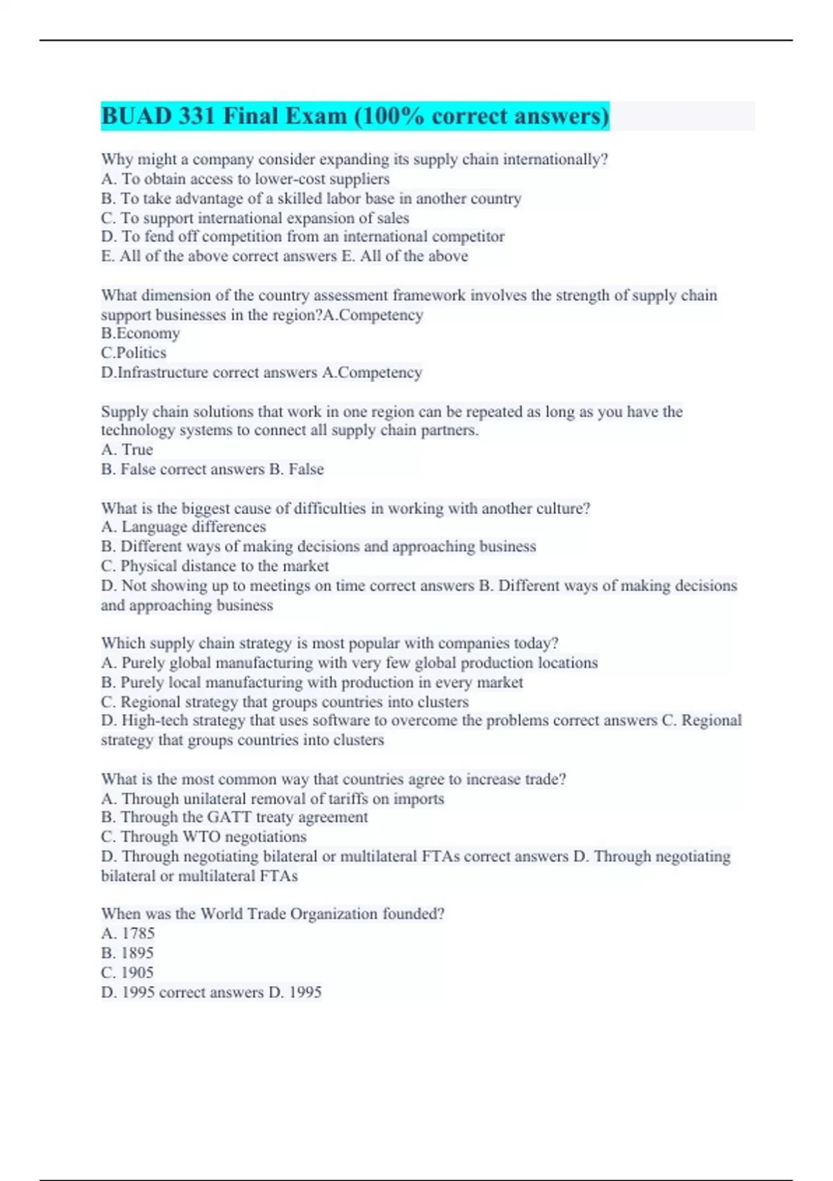 Why might a company consider expanding its supply chain internationally? A. To obtain access to lower-cost suppliers B. To take advantage of a skilled labor base in another country C. To support international expansion of sales D. To fend off competition from an international competitor E. All of the above correct answers E. All of the above What dimension of the country assessment framework involves the strength of supply chain support businesses in the region?A.Competency B.Economy C.Politics D.Infrastructure correct answers A.Competency Supply chain solutions that work in one region can be repeated as long as you have the technology systems to connect all supply chain partners. A. True B. False correct answers B. False What is the biggest cause of difficulties in working with another culture? A. Language differences B. Different ways of making decisions and approaching business C. Physical distance to the market D. Not showing up to meetings on time correct answers B. Different ways of making decisions and approaching business Which supply chain strategy is most popular with companies today? A. Purely global manufacturing with very few global production locations B. Purely local manufacturing with production in every market C. Regional strategy that groups countries into clusters D. High-tech strategy that uses software to overcome the problems correct answers C. Regional strategy that groups countries into clusters What is the most common way that countries agree to increase trade? A. Through unilateral removal of tariffs on imports B. Through the GATT treaty agreement C. Through WTO negotiations D. Through negotiating bilateral or multilateral FTAs correct answers D. Through negotiating bilateral or multilateral FTAs When was the World Trade Organization founded? A. 1785 B. 1895 C. 1905 D. 1995 correct answers D. 1995