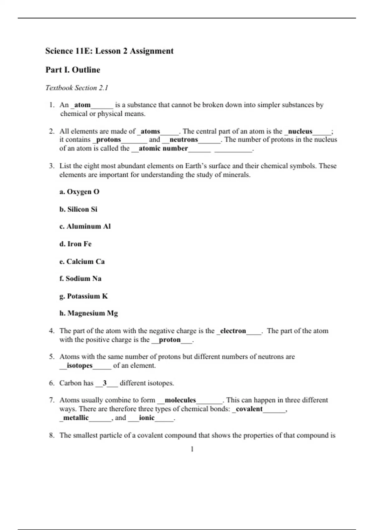 This is mainly short-answer assignment that contains questions along with answers related to the atomic structure, molecules, structure and properties of various minerals.