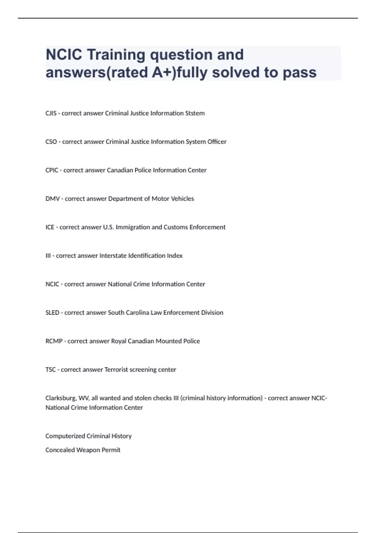 NCIC Training question and answers(rated A+)fully solved to passCJIS - correct answer Criminal Justice Information Ststem CSO - correct answer Criminal Justice Information System Officer CPIC - correct answer Canadian Police Information Center DMV - correct answer Department of Motor Vehicles ICE - correct answer U.S. Immigration and Customs Enforcement III - correct answer Interstate Identification Index NCIC - correct answer National Crime Information Center SLED - correct answer South Carolina Law Enforcement Division RCMP - correct answer Royal Canadian Mounted Police TSC - correct answer Terrorist screening center Clarksburg, WV, all wanted and stolen checks III (criminal history information) - correct answer NCIC- National Crime Information Center Computerized Criminal History Concealed Weapon Permit