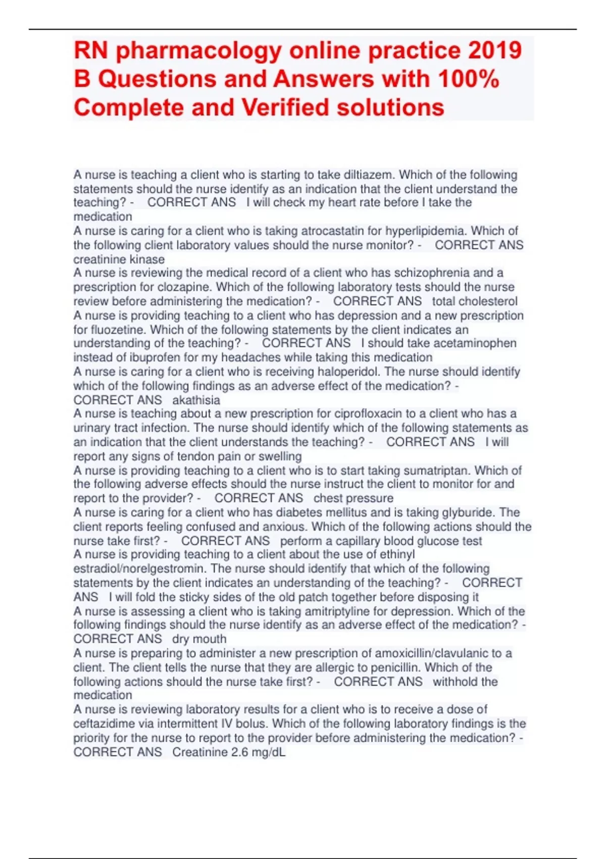 A nurse is teaching a client who is starting to take diltiazem. Which of the following statements should the nurse identify as an indication that the client understand the teaching? - CORRECT ANS I will check my heart rate before I take the medication A nurse is caring for a client who is taking atrocastatin for hyperlipidemia. Which of the following client laboratory values should the nurse monitor? - CORRECT ANS creatinine kinase A nurse is reviewing the medical record of a client who has schizophrenia and a prescription for clozapine. Which of the following laboratory tests should the nurse review before administering the medication? - CORRECT ANS total cholesterol A nurse is providing teaching to a client who has depression and a new prescription for fluozetine. Which of the following statements by the client indicates an understanding of the teaching? - CORRECT ANS I should take acetaminophen instead of ibuprofen for my headaches while taking this medication A nurse is caring for a client who is receiving haloperidol. The nurse should identify which of the following findings as an adverse effect of the medication? - CORRECT ANS akathisia A nurse is teaching about a new prescription for ciprofloxacin to a client who has a urinary tract infection. The nurse should identify which of the following statements as an indication that the client understands the teaching? - CORRECT ANS I will report any signs of tendon pain or swelling A nurse is providing teaching to a client who is to start taking sumatriptan. Which of the following adverse effects should the nurse instruct the client to monitor for and report to the provider? - CORRECT ANS chest pressure A nurse is caring for a client who has diabetes mellitus and is taking glyburide. The client reports feeling confused and anxious. Which of the following actions should the nurse take first? - CORRECT ANS perform a capillary blood glucose test A nurse is providing teaching to a client about the use of ethinyl estradiol/norelgestromin. The nurse should identify that which of the following statements by the client indicates an understanding of the teaching? - CORRECT ANS I will fold the sticky sides of the old patch together before disposing it A nurse is assessing a client who is taking amitriptyline for depression. Which of the following findings should the nurse identify as an adverse effect of the medication? - CORRECT ANS dry mouth A nurse is preparing to administer a new prescription of amoxicillin/clavulanic to a client. The client tells the nurse that they are allergic to penicillin. Which of the following actions should the nurse take first? - CORRECT ANS withhold the medication A nurse is reviewing laboratory results for a client who is to receive a dose of ceftazidime via intermittent IV bolus. Which of the following laboratory findings is the priority for the nurse to report to the provider before administering the medication? - CORRECT ANS Creatinine 2.6 mg/dL