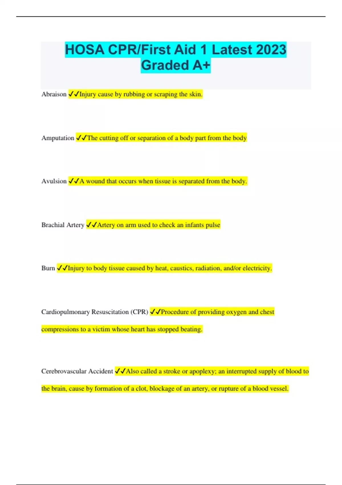 HOSA CPR/First Aid 1 Latest 2023 Graded A+ Abraison Injury cause by rubbing or scraping the skin. Amputation The cutting off or separation of a body part from the body Avulsion A wound that occurs when tissue is separated from the body. Brachial Artery Artery on arm used to check an infants pulse Burn Injury to body tissue caused by heat, caustics, radiation, and/or electricity. Cardiopulmonary Resuscitation (CPR) Procedure of providing oxygen and chest compressions to a victim whose heart has stopped beating. Cerebrovascular Accident Also called a stroke or apoplexy; an interrupted supply of blood to the brain, cause by formation of a clot, blockage of an artery, or rupture of a blood vessel. Convulsion Also called a seizure; a violent, involuntary contractions of the muscles. Diabetic Coma An unconscious condition caused by increased level of glucose (sugar) and ketones in the bloodstream of a person with diabetic mellitus. Diaphoresis Profuse or excessive perspiration, or sweating. Disclocation Displacement of a bone at a joint. Dyspnea Difficulty breathing Fainting Partial or complete loss of consciousness caused by a temporary reduction in the supply of blood to the brain. First Aid Immediate care given to a victim of an injury or illness to minimize the effects of the injury or illness. Fracture A break (usually, a break in a bone or tooth). Frostbite Actually freezing of tissue fluid resulting in damage to the skin and underlying tissue. Heart Attack (myocardial infarction) A reduction in the supply of blood to the heart resulting in damage to the mucked of the heart. Heart Cramps Muscle pain and spasm resulting from exposure to heat and inadequate fluid and salt intake. Heat Exhaustion Condition resulting from exposure to hear and excessive loss of fluid through sweating. Heat Stroke Medical emergency caused by prolonged exposure to heat, resulting in high body temperature and failure of sweat glands. Hemorrhage Excessive loss of blood; bleeding of a blood vessel Hypothermia Condition that occurred when the body temperature exceeds 104°F, or 40°C, rectally. Incision Cut or wound of body tissue caused by a sharp object; a surgical cut. Infection Invasion by organisms; contamination by disease-producing organisms, or pathogens. Insulin Shock Condition that occurs in individuals with diabetes when there is an excess amount of insulin and a low level of glucose (sugar) in the blood. Laceration Wound or injury with jagged, irregular edges. Poisoning Condition that occurs when contact is made with any chemical substance that causes injury, illness, or death. Puncture This type of wound is caused by a sharp object such as a pin, nail, or pointed instrument. Shock Clinical condition characterized by various symptoms and resulting in an inadequate supply of blood and oxygen to the body organs, especially the brain and heart. Sprain Injury to a joint accompanied by stretching or tearing of the ligaments. Strain Injury caused by excessive stretching, overuse, or misuse of a muscle. Triage A method of prioritizing treatment. Wound An injury of tissues caused by a cut or blow typically one in which the skin is cut or broken Carotid Artery Artery in neck that is used to check an adults or childs pulse