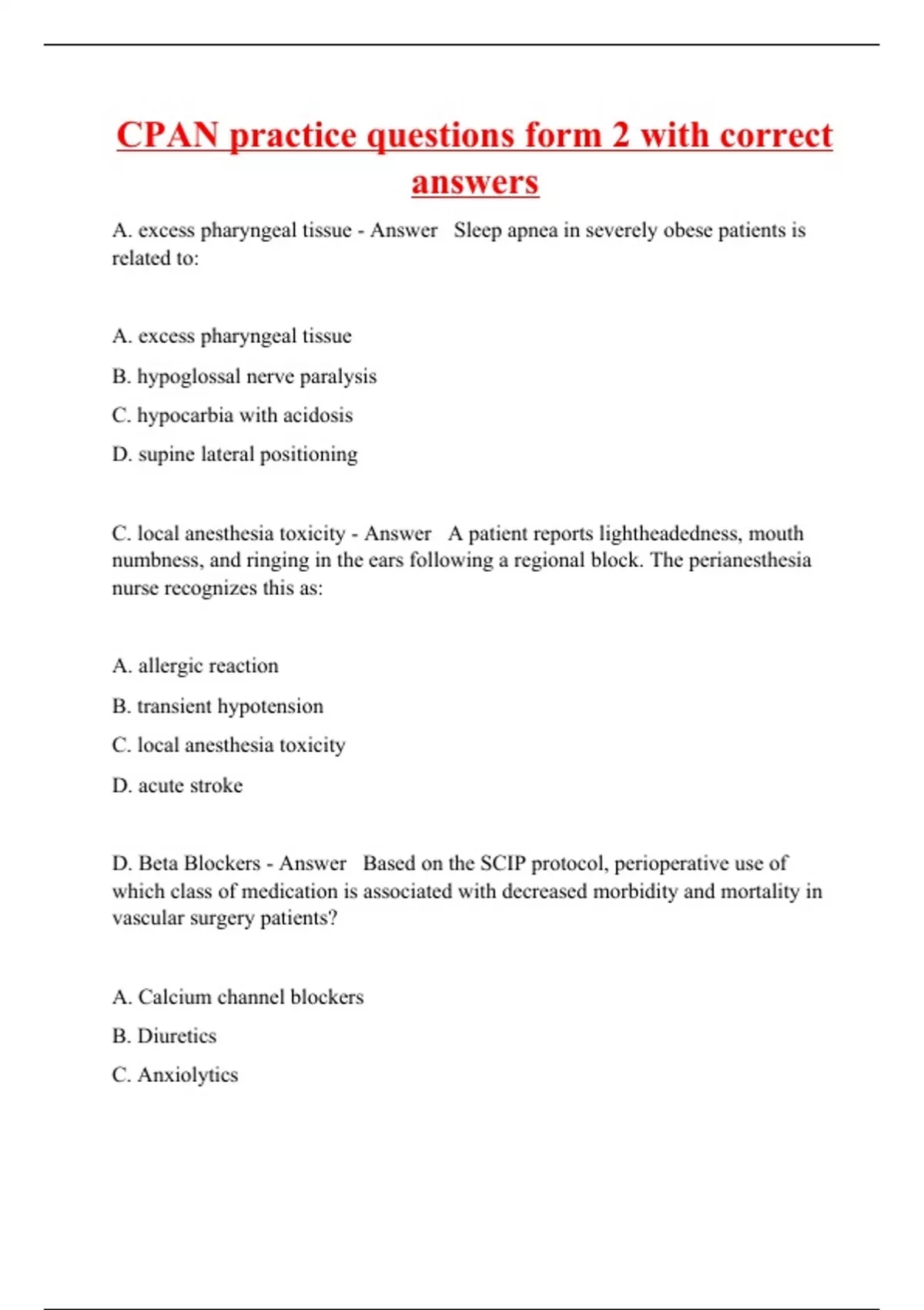 A. excess pharyngeal tissue - Answer Sleep apnea in severely obese patients is related to: A. excess pharyngeal tissue B. hypoglossal nerve paralysis C. hypocarbia with acidosis D. supine lateral positioning C. local anesthesia toxicity - Answer A patient reports lightheadedness, mouth numbness, and ringing in the ears following a regional block. The perianesthesia nurse recognizes this as: A. allergic reaction B. transient hypotension C. local anesthesia toxicity D. acute stroke D. Beta Blockers - Answer Based on the SCIP protocol, perioperative use of which class of medication is associated with decreased morbidity and mortality in vascular surgery patients? A. Calcium channel blockers B. Diuretics C. Anxiolytics