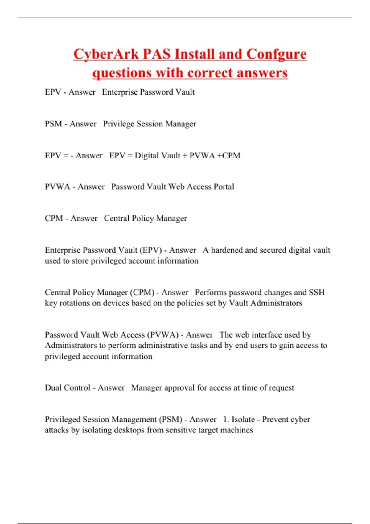 EPV - Answer Enterprise Password Vault PSM - Answer Privilege Session Manager EPV = - Answer EPV = Digital Vault + PVWA +CPM PVWA - Answer Password Vault Web Access Portal CPM - Answer Central Policy Manager Enterprise Password Vault (EPV) - Answer A hardened and secured digital vault used to store privileged account information Central Policy Manager (CPM) - Answer Performs password changes and SSH key rotations on devices based on the policies set by Vault Administrators Password Vault Web Access (PVWA) - Answer The web interface used by Administrators to perform administrative tasks and by end users to gain access to privileged account information Dual Control - Answer Manager approval for access at time of request Privileged Session Management (PSM) - Answer 1. Isolate - Prevent cyber attacks by isolating desktops from sensitive target