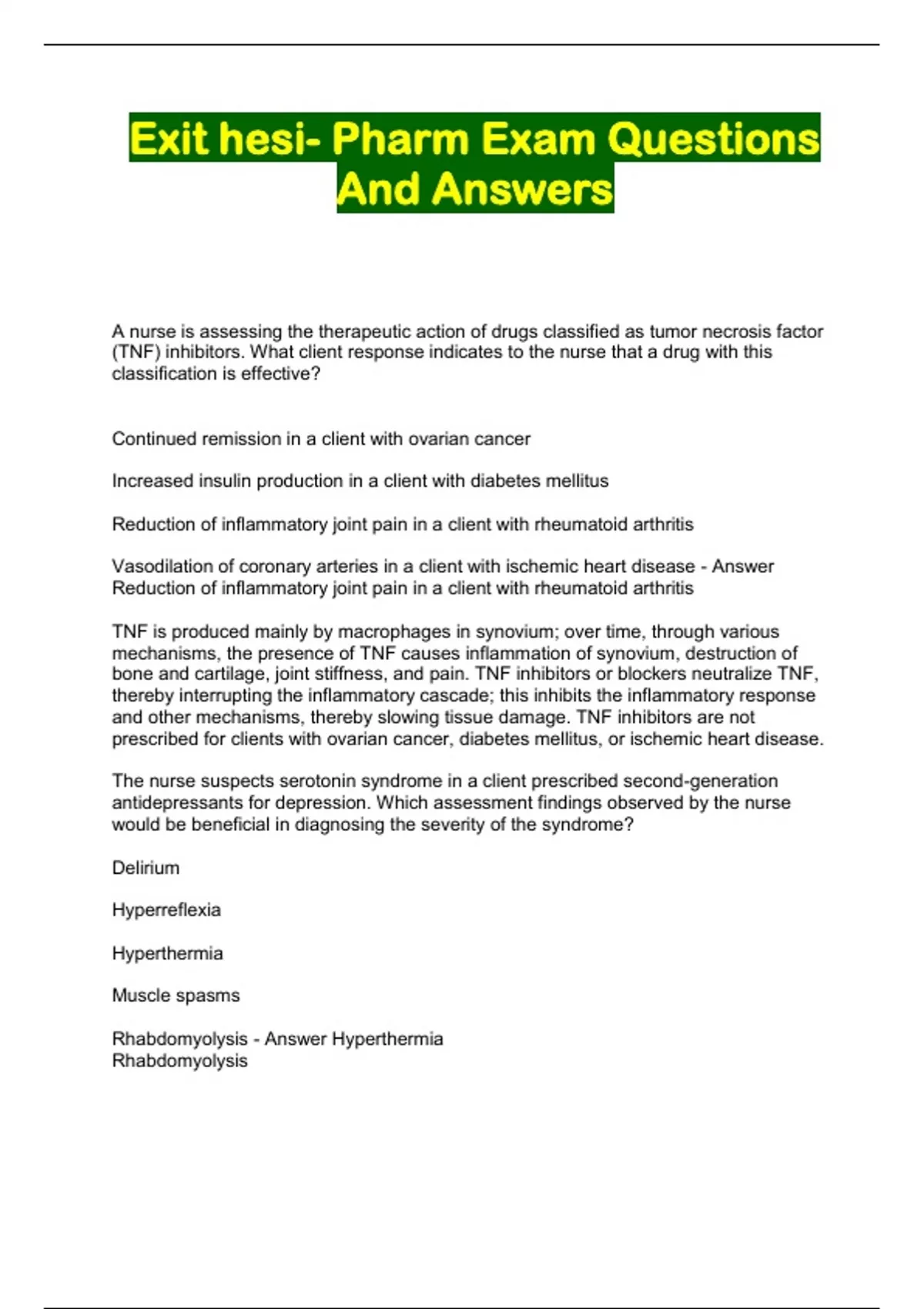 Exit hesi- Pharm Ex am Qu estions And An swers A nurse is assessing the therapeutic action of drugs classified as tumor necrosis factor (TNF) inhibitors. What client response indicates to the nurse that a drug with this classification is effective? Continued remission in a client with ovarian cancer Increased insulin production in a client with diabetes mellitus Reduction of inflammatory joint pain in a client with rheumatoid arthritis Vasodilation of coronary arteries in a client with ischemic heart disease - Answer Reduction of inflammatory joint pain in a client with rheumatoid arthritis TNF is produced mainly by macrophages in synovium; over time, through various mechanisms, the presence of TNF causes inflammation of synovium, destruction o f bone and cartilage, joint stiffness, and pain. TNF inhibitors or blockers neutralize TNF, thereby interrupting the inflammatory cascade; this inhibits the inflammatory response and other mechanisms, thereby slowing tissue damage. TNF inhibitors are not prescribed for clients with ovarian cancer, diabetes mellitus, or ischemic heart disease. The nurse suspects serotonin syndrome in a client prescribed second-generation antidepressants for depression. Which assessment findings observed by the nurse would be beneficial in diagnosing the severity of the syndrome? Delirium Hyperreflexia Hyperthermia Muscle spasms Rhabdomyolysis - Answer Hyperthermia Rhabdomyolysis Serotonin syndrome is a potentially hazardous adverse effect of second-generation antidepressants that are used to treat depression. Hyperthermia and rhabdomyolysis are symptoms observed in severe cases of serotonin syndrome. Delirium, hyperreflexia, and muscle spasms are common symptoms of this syndrome. A healthcare provider prescribes enoxaparin 30 mg subcutaneously daily. Which measure would the nurse take when administering this medication? Push over 2 minutes. Administer in the abdomen. Rub site after administration. Remove air pocket from prepackaged syringe before administration. - Answer Administer in the abdomen. Enoxaparin specifically targets blood clots throughout the body and carries a lo wer risk of hemorrhage than that associated with the drugs heparin and warfarin. Eno xaparin is administered once a day through a subcutaneous injection site around the naval. Enoxaparin should be injected into the fatty tissue only, which is why the ab domen is the recommended injection site. Avoid administering in a muscle. Manufacturer recommendations indicate the air pocket from prepackaged syringes not be remov ed before administration. Rubbing the site is contraindicated, as it can cause bruising. There are no recommendations to push this subcutaneous medication over 2 minute s. A client with cirrhosis of the liver and ascites has been taking chlorothiazide, a thiazide diuretic. Why did the provider add spironolactone to the client's medication regimen? To stimulate sodium excretion To help prevent potassium loss To increase urine specific gravity To reduce arterial blood pressure - Answer To help prevent potassium loss Spironolactone is a potassium-sparing diuretic often used in conjunction with thiazide diuretics. The provider was prompted to add spironolactone to the chlorothiazide to prevent potassium loss. Both medications stimulate sodium excretion. Both medications increase urine specific gravity and reduce arterial blood pressure. A client with myasthenia gravis improves and is discharged from the hospital. The discharge medications include pyridostigmine bromide 10 mg every 6 hours. The nurse evaluates that the drug regimen is understood when the client makes which statement? "I will take the medication on an empty stomach." "I need to set an alarm so I take the medication on time." "It will be important to check my heart rate before taking the medication." "I should monitor for an increase in blood pressure after taking the medication." - Answer "I need to set an alarm so I take the medication on time." Pyridostigmine is a vital drug that must be taken on time; a missed or late dose can result in severe respiratory and neuromuscular consequences or even death. Pyridostigmine should be taken with a small amount of food to prevent gastric irritation . It is unnecessary to take the pulse rate before taking pyridostigmine. Pyridostigmine may cause hypotension, not hypertension, which is a sign of cholinergic crisis. A client has been taking 3 mg of risperidone twice a day for the past 8 days. At th e follow-up appointment, the client reports tremors, shortness of breath, a fever, and sweating. What will the nurse do? Call 911 and have the client transported to the nearest psychiatric unit. Take the client's vital signs and arrange for immediate transfer to a hospital. Check the number of risperidone tablets left in the prescription bottle to see whet her there was an overdose. Request a prescription for 2 mg of intramuscular benztropine stat and assess the client in 10 to 15 minutes for symptom relief. - Answer Take the client's vital signs and arrange for immediate transfer to a hospital. These clinical manifestations signal the presence of neuroleptic malignant syndrome; the cardinal sign of this condition is a high body temperature. Therefore the nurse first should document the hyperthermia and then arrange for immediate hosp italization. Unless the client is experiencing impaired ventilation, it is important to complete a focused assessment before transfer. The care needed can be provided in an emergency department or medical unit, not a psychiatric unit. Neuroleptic malignant syndrome may occur without an overdose; this syndrome can occur when a high-