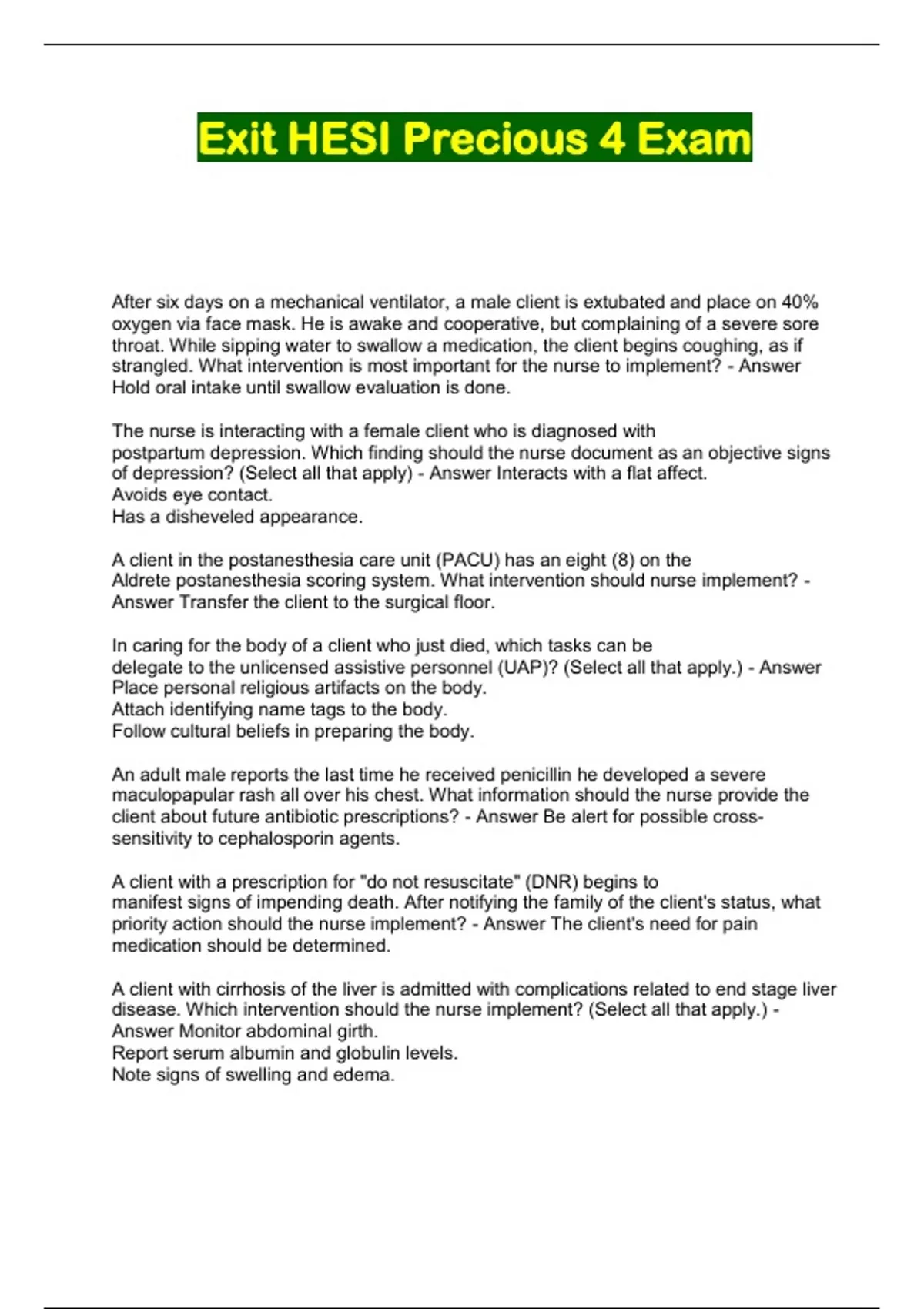 Exit HESI Precious 4 Exam After six days on a mechanical ventilator, a male client is extubated and place on 40% oxygen via face mask. He is awake and cooperative, but complaining of a severe sore throat. While sipping water to swallow a medication, the client begins coughing, as if strangled. What intervention is most important for the nurse to implement? - Answer Hold oral intake until swallow evaluation is done. The nurse is interacting with a female client who is diagnosed with postpartum depression. Which finding should the nurse document as an objective signs of depression? (Select all that apply) - Answer Interacts with a flat affect. Avoids eye contact. Has a disheveled appearance. A client in the postanesthesia care unit (PACU) has an eight (8) on the Aldrete postanesthesia scoring system. What intervention should nurse implemen t? - Answer Transfer the client to the surgical floor. In caring for the body of a client who just died, which tasks can be delegate to the unlicensed assistive personnel (UAP)? (Select all that apply.) - Answ er Place personal religious artifacts on the body. Attach identifying name tags to the body. Follow cultural beliefs in preparing the body. An adult male reports the last time he received penicillin he developed a severe maculopapular rash all over his chest. What information should the nurse provide th e client about future antibiotic prescriptions? - Answer Be alert for possible cross-
