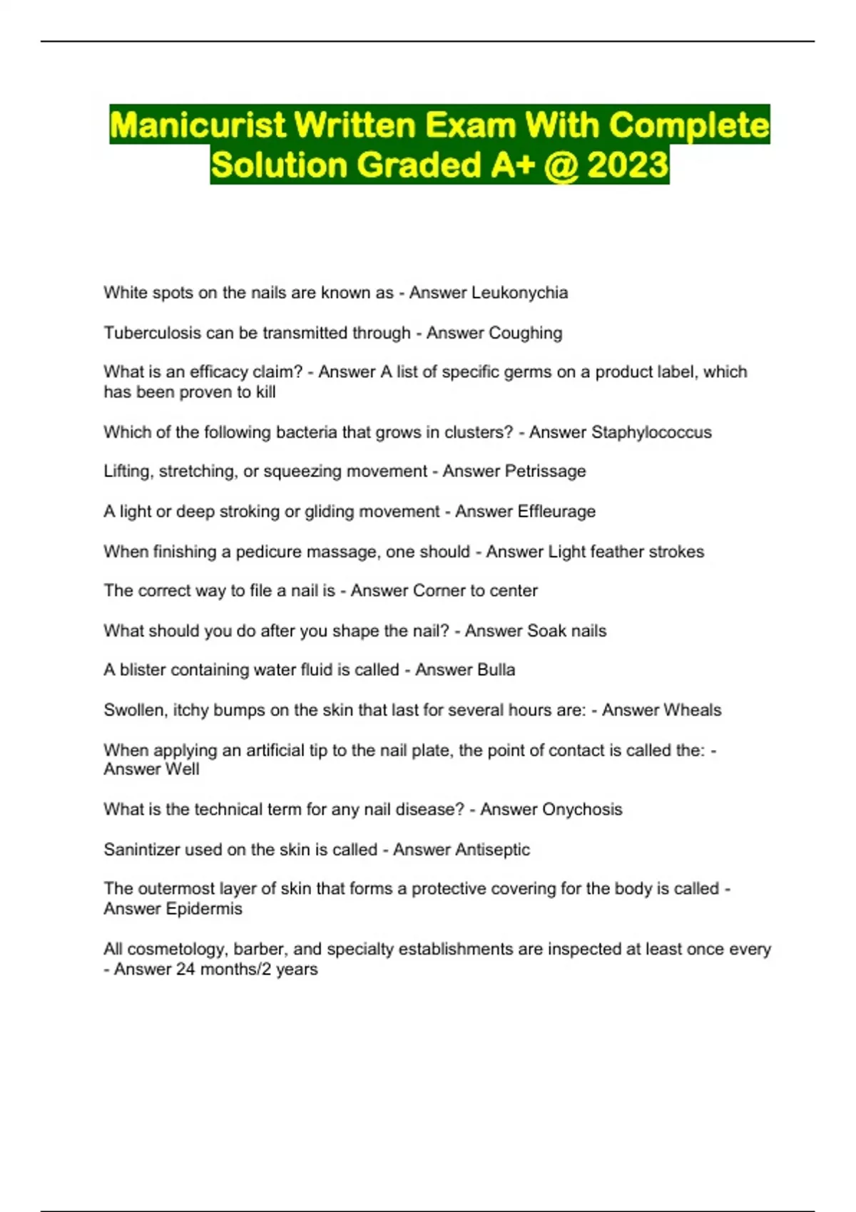 Manicurist Written Exam With Complete Solution Graded A+ @ 2023...