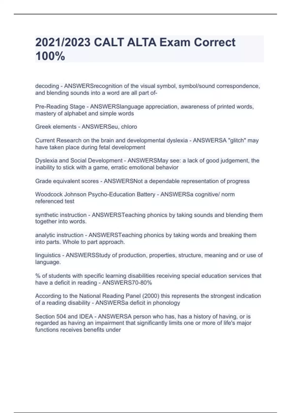 Pre-Reading Stage - ANSWERSlanguage appreciation, awareness of printed words, mastery of alphabet and simple words decoding - ANSWERSrecognition of the visual symbol, symbol/sound correspondence, and blending sounds into a word are all part of- Greek elements - ANSWERSeu, chloro Current Research on the brain and developmental dyslexia - ANSWERSA "glitch" may have taken place during fetal development Dyslexia and Social Development - ANSWERSMay see: a lack of good judgement, the inability to stick with a game, erratic emotional behavior Grade equivalent scores - ANSWERSNot a dependable representation of progress Woodcock Johnson Psycho-Education Battery - ANSWERSa cognitive/ norm referenced test synthetic instruction - ANSWERSTeaching phonics by taking sounds and blending them together into words. analytic instruction - ANSWERSTeaching phonics by taking words and breaking them into parts. Whole to part approach. linguistics - ANSWERSStudy of production, properties, structure, meaning and or use of language. % of students with specific learning disabilities receiving special education services that have a deficit in reading - ANSWERS70-80% According to the National Reading Panel (2000) this represents the strongest indication of a reading disability - ANSWERSa deficit in phonology Section 504 and IDEA - ANSWERSA person who has, has a history of having, or is regarded as having an impairment that significantly limits one or more of life's major functions receives benefits under