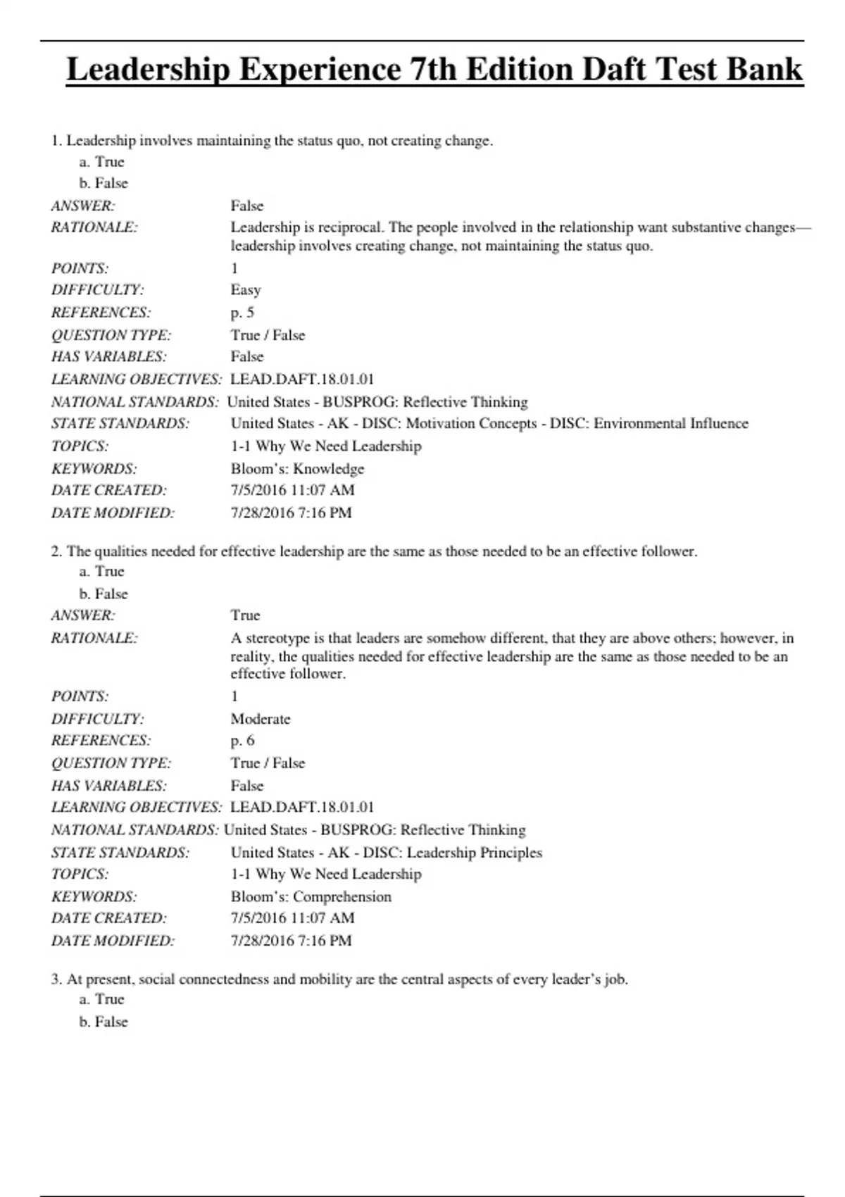 Test Bank for Leadership Experience 7th Edition Daft / All Chapters 1 - 30 / Full Complete