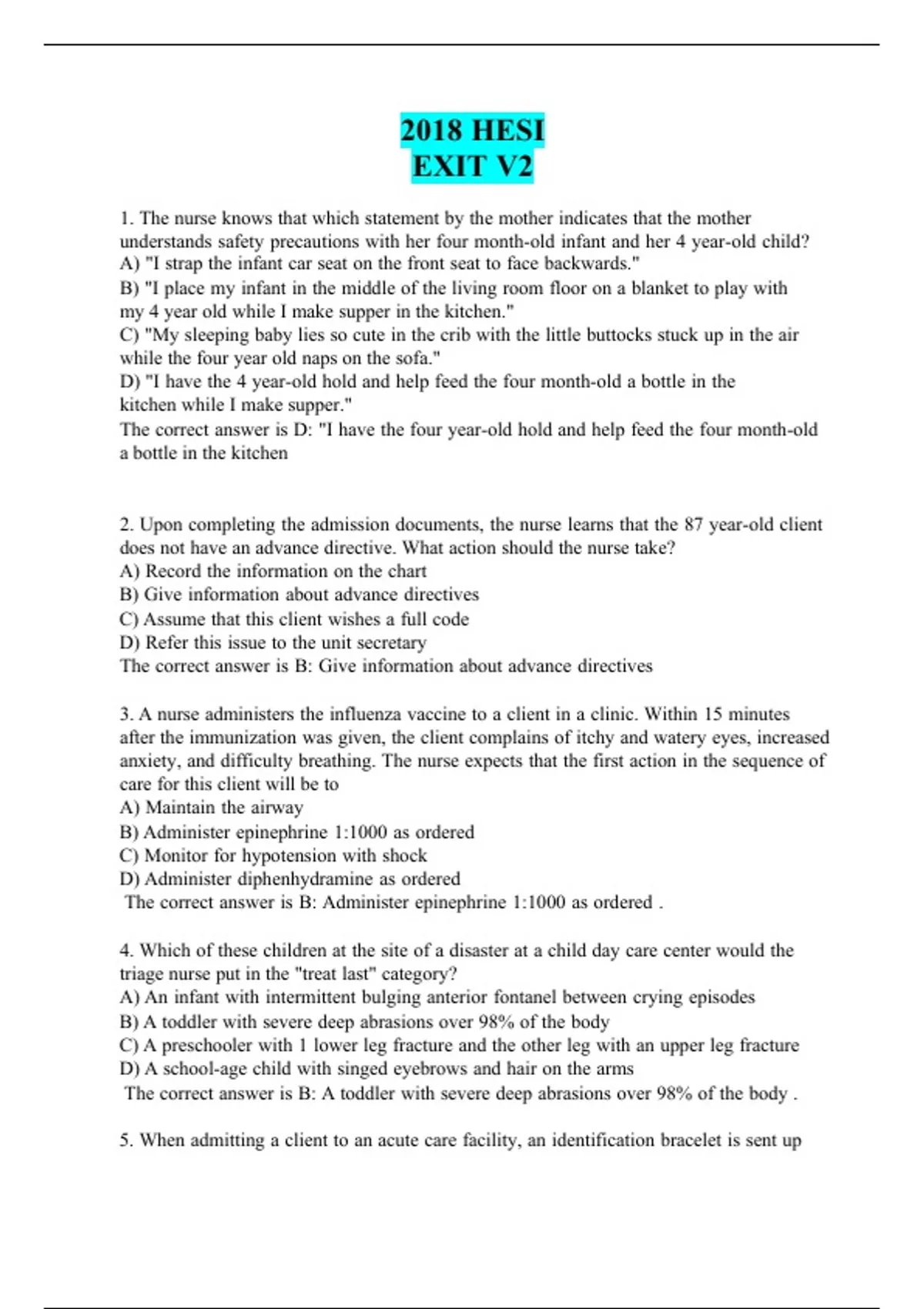 2018 HESI EXIT V2 1. The nurse knows that which statement by the mother indicates that the mother understands safety precautions with her four month-old infant and her 4 year-old child? A) "I strap the infant car seat on the front seat to face backwards." B) "I place my infant in the middle of the living room floor on a blanket to play with my 4 year old while I make supper in the kitchen." C) "My sleeping baby lies so cute in the crib with the little buttocks stuck up in the air while the four year old naps on the sofa." D) "I have the 4 year-old hold and help feed the four month-old a bottle in the kitchen while I make supper." The correct answer is D: "I have the four year-old hold and help feed the four month-old a bottle in the kitchen 2. Upon completing the admission documents, the nurse learns that the 87 year-old client does not have an advance directive. What action should the nurse take? A) Record the information on the chart B) Give information about advance directives C) Assume that this client wishes a full code D) Refer this issue to the unit secretary The correct answer is B: Give information about advance directives 3. A nurse administers the influenza vaccine to a client in a clinic. Within 15 minutes after the immunization was given, the client complains of itchy and watery eyes, increased anxiety, and difficulty breathing. The nurse expects that the first action in the sequence of care for this client will be to A) Maintain the airway B) Administer epinephrine 1:1000 as ordered C) Monitor for hypotension with shock D) Administer diphenhydramine as ordered The correct answer is B: Administer epinephrine 1:1000 as ordered . 4. Which of these children at the site of a disaster at a child day care center would the triage nurse put in the "treat last" category? A) An infant with intermittent bulging anterior fontanel between crying episodes B) A toddler with severe deep abrasions over 9