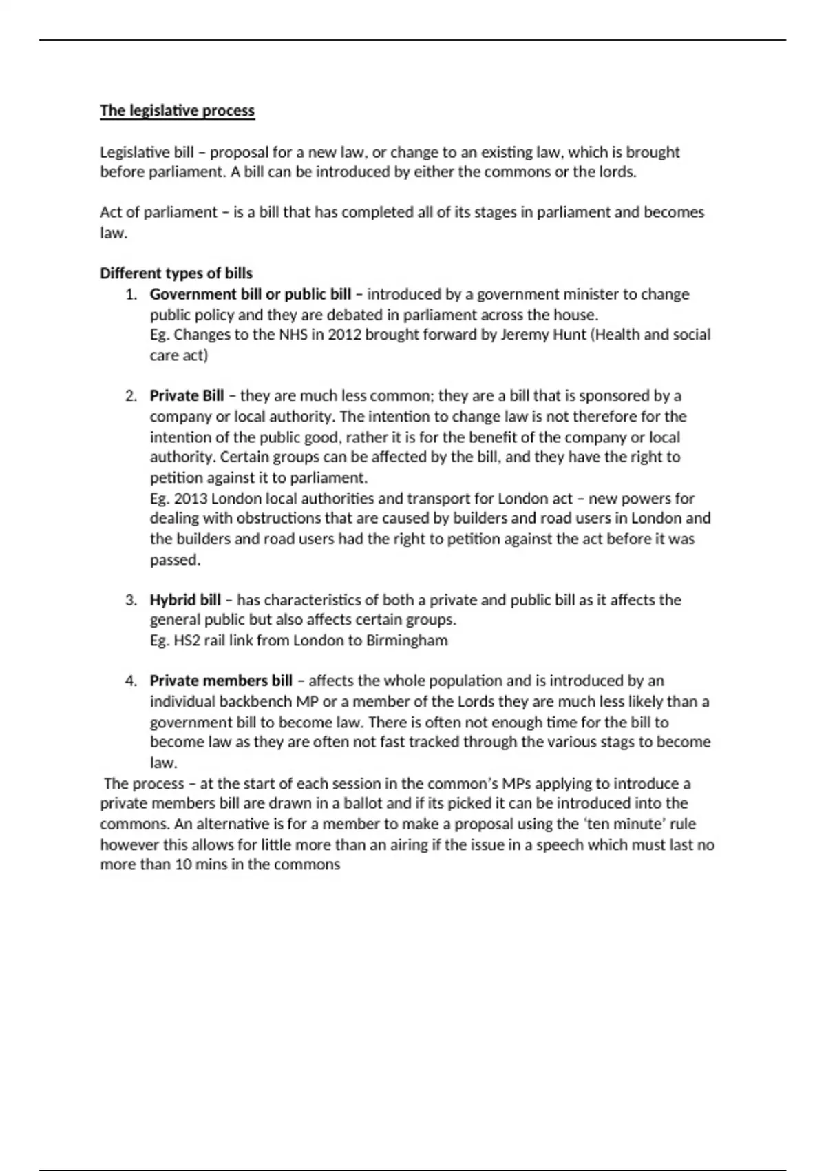 Summary Revision notes on how the legislative process works in UK parliament