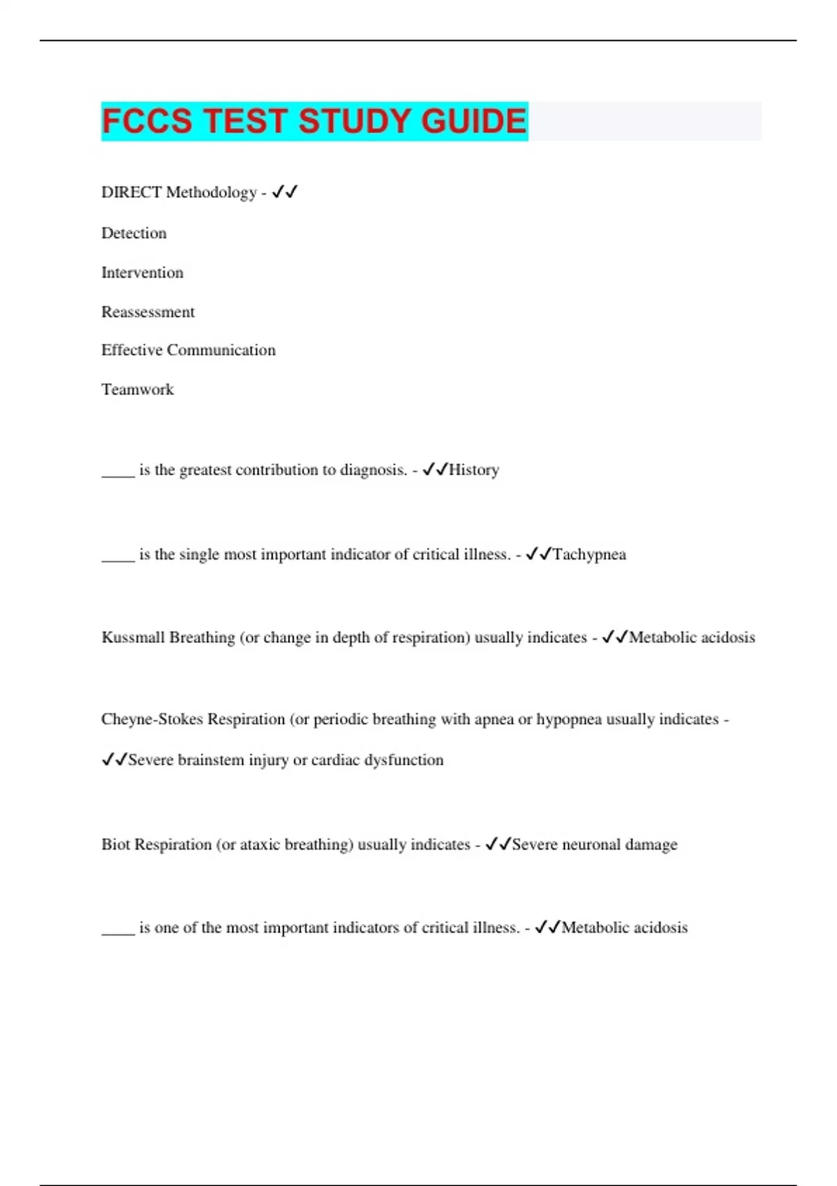 DIRECT Methodology - Detection Intervention Reassessment Effective Communication Teamwork ____ is the greatest contribution to diagnosis. - History ____ is the single most important indicator of critical illness. - Tachypnea Kussmall Breathing (or change in depth of respiration) usually indicates - Metabolic acidosis Cheyne-Stokes Respiration (or periodic breathing with apnea or hypopnea usually indicates - Severe brainstem injury or cardiac dysfunction Biot Respiration (or ataxic breathing) usually indicates - Severe neuronal damage ____ is one of the most important indicators of critical illness. - Metabolic acidosis