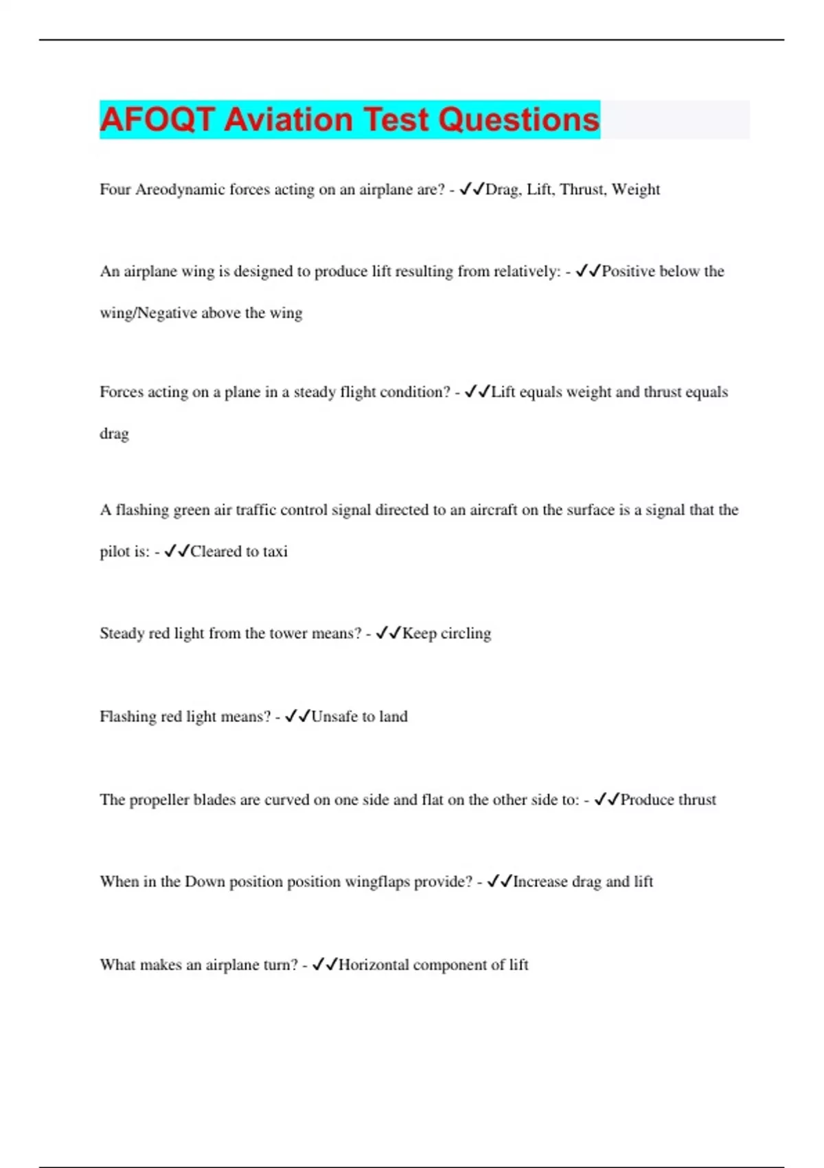 Four Areodynamic forces acting on an airplane are? - Drag, Lift, Thrust, Weight An airplane wing is designed to produce lift resulting from relatively: - Positive below the wing/Negative above the wing Forces acting on a plane in a steady flight condition? - Lift equals weight and thrust equals drag A flashing green air traffic control signal directed to an aircraft on the surface is a signal that the pilot is: - Cleared to taxi Steady red light from the tower means? - Keep circling Flashing red light means? - Unsafe to land The propeller blades are curved on one side and flat on the other side to: - Produce thrust When in the Down position position wingflaps provide? - Increase drag and lift