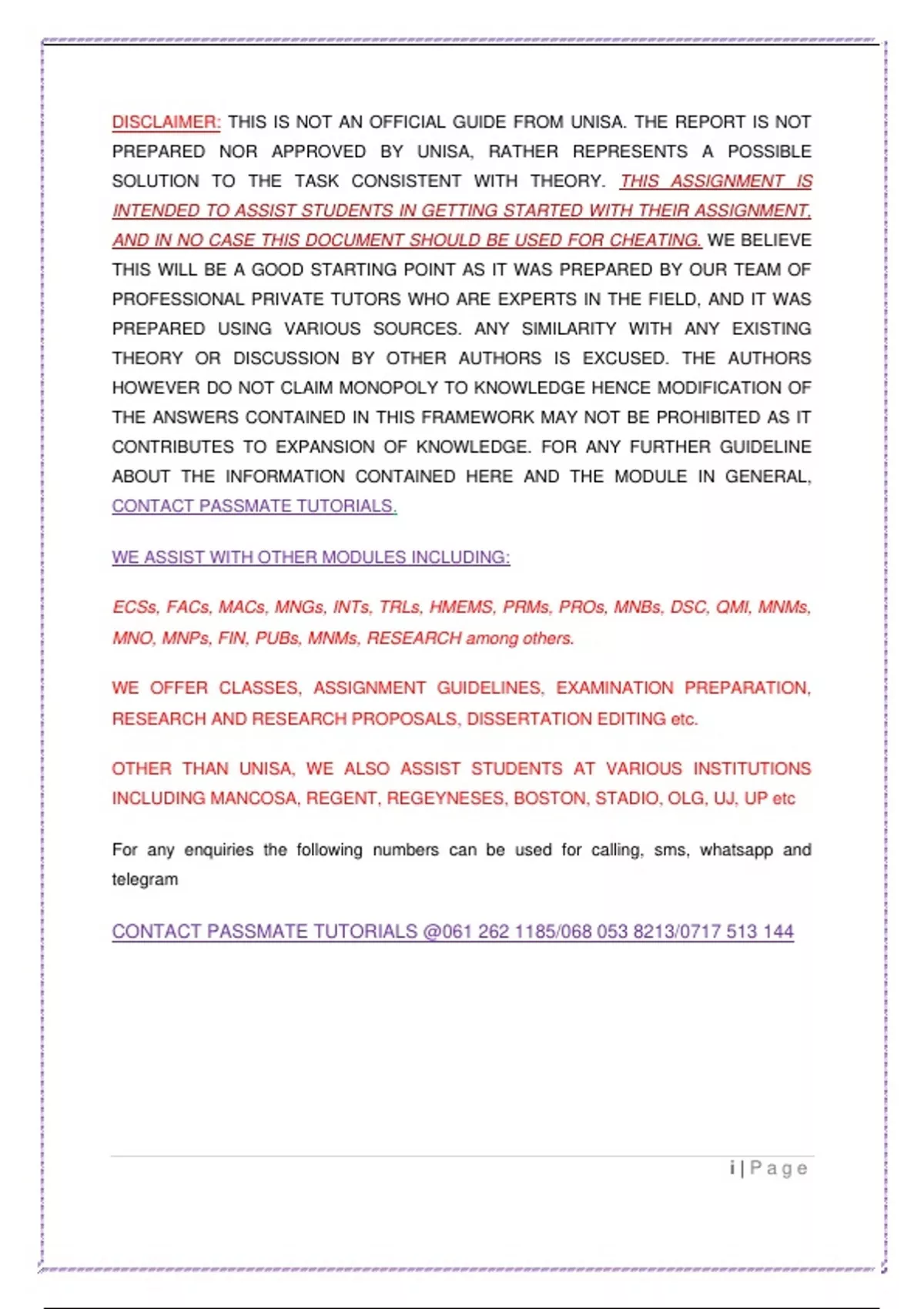 DISCLAIMER: THIS IS NOT AN OFFICIAL GUIDE FROM UNISA. THE REPORT IS NOT