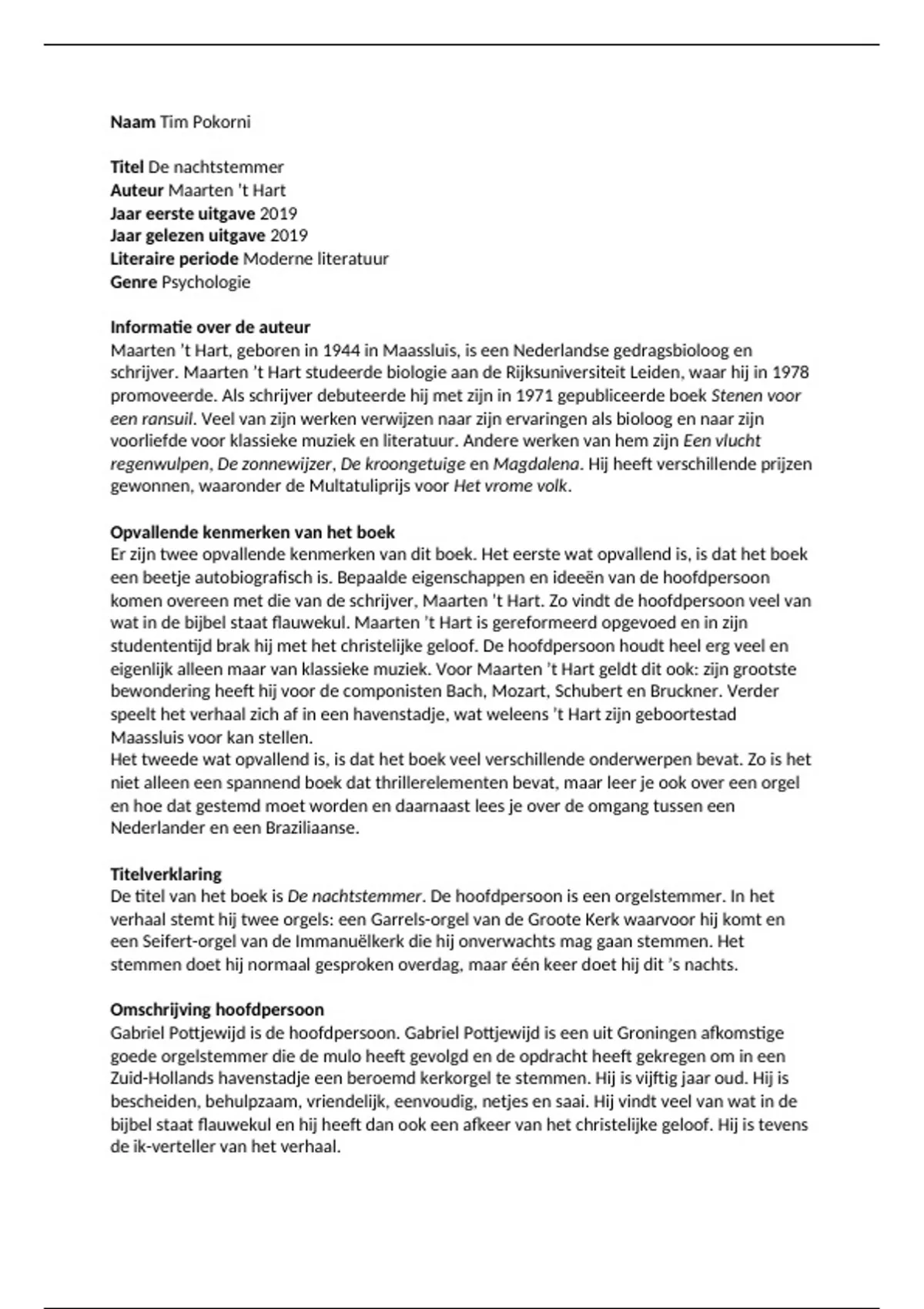 komen overeen met die van de schrijver, Maarten ’t Hart. Zo vindt de hoofdpersoon veel van