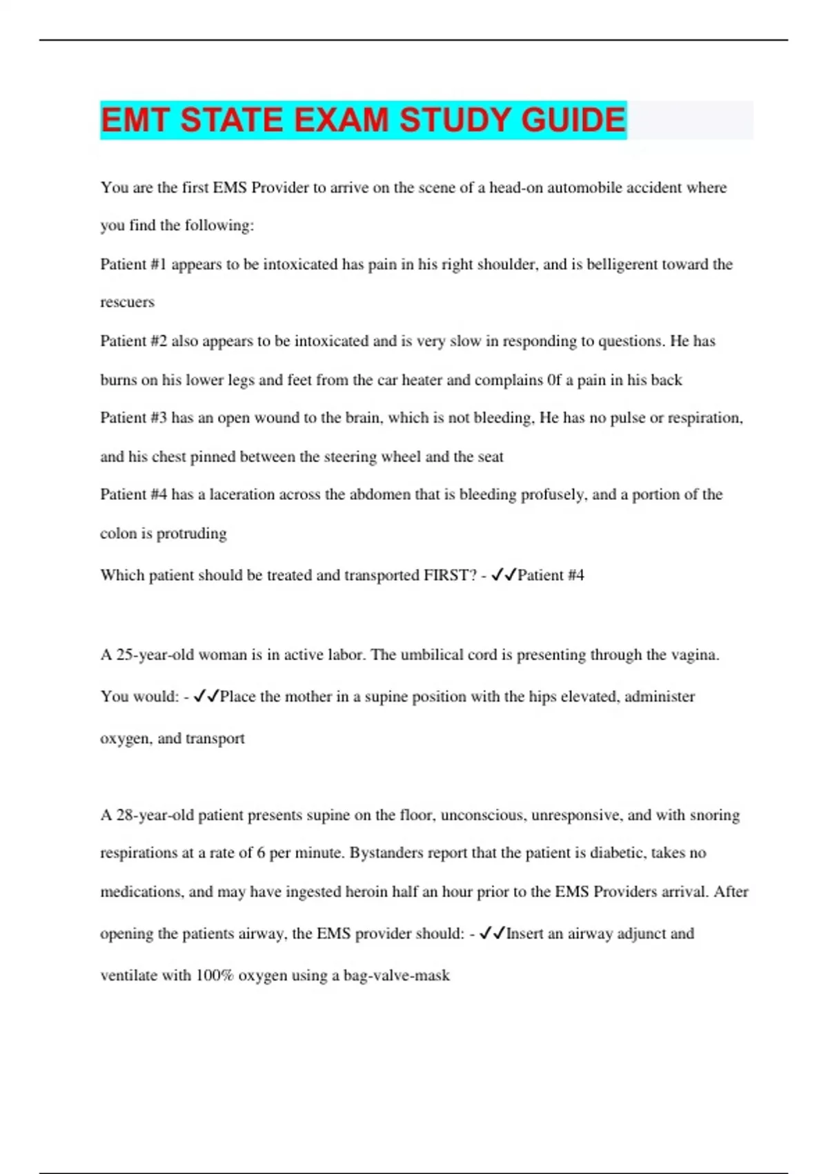 EMT STATE EXAM STUDY GUIDE | 208 Questions with 100% Correct Answers | Verified | 31 Pages