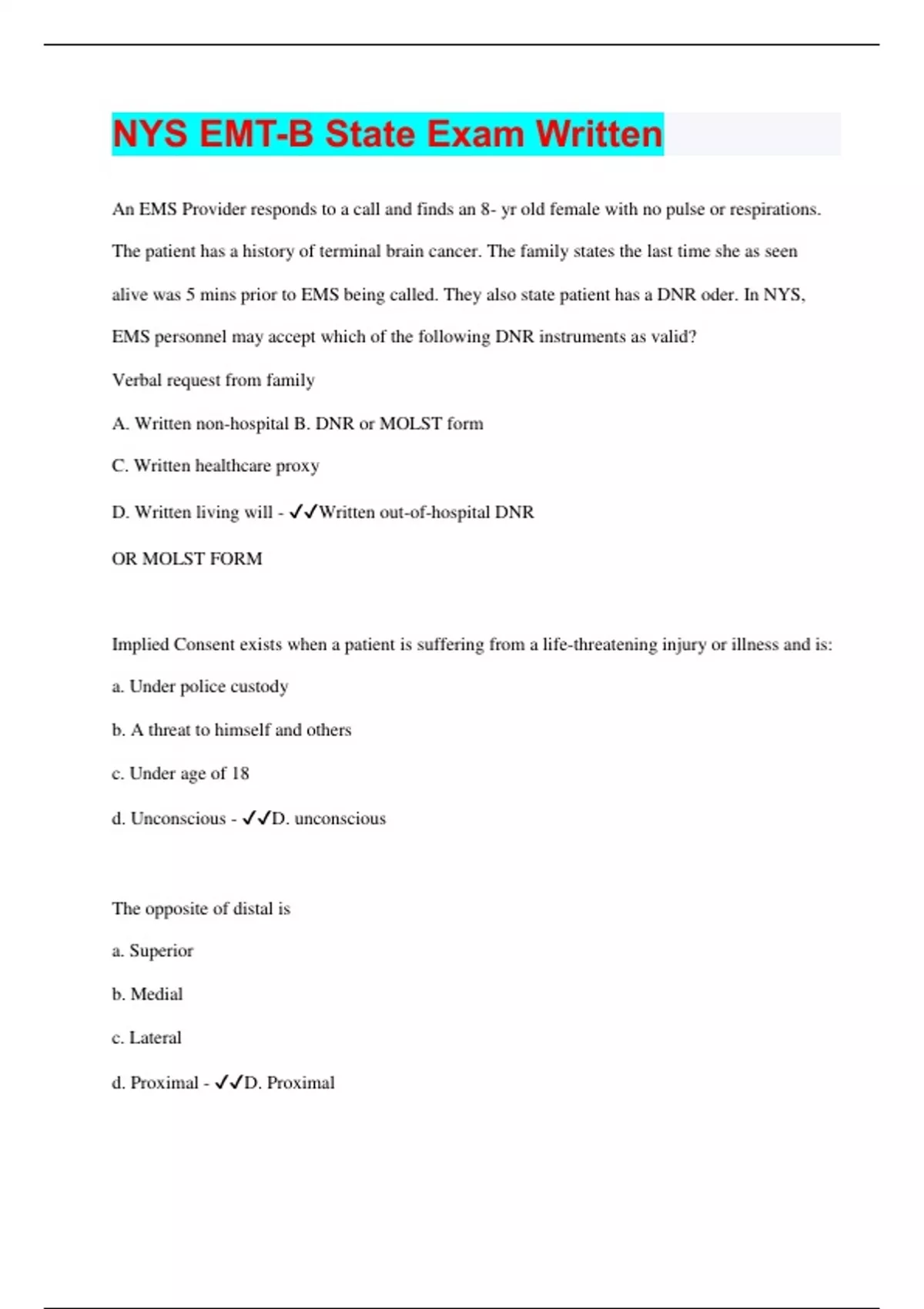An EMS Provider responds to a call and finds an 8- yr old female with no pulse or respirations. The patient has a history of terminal brain cancer. The family states the last time she as seen alive was 5 mins prior to EMS being called. They also state patient has a DNR oder. In NYS, EMS personnel may accept which of the following DNR instruments as valid? Verbal request from family A. Written non-hospital B. DNR or MOLST form C. Written healthcare proxy D. Written living will - Written out-of-hospital DNR OR MOLST FORM Implied Consent exists when a patient is suffering from a life-threatening injury or illness and is: a. Under police custody b. A threat to himself and others c. Under age of 18 d. Unconscious - D. unconscious The opposite of distal is a. Superior b. Medial c. Lateral d. Proximal - D. Proximal
