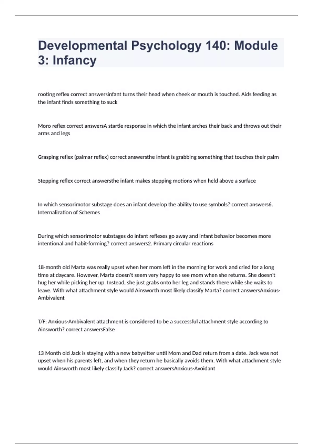 rooting reflex infant turns their head when cheek or mouth is touched. Aids feeding as the infant finds something to suck Moro reflex A startle response in which the infant arches their back and throws out their arms and legs Grasping reflex (palmar reflex) the infant is grabbing something that touches their palm Stepping reflex the infant makes stepping motions when held above a surface In which sensorimotor substage does an infant develop the ability to use symbols? 6. Internalization of Schemes During which sensorimotor substages do infant reflexes go away and infant behavior becomes more intentional and habit-forming? 2. Primary circular reactions 18-month old Marta was really upset when her mom left in the morning for work and cried for a long time at daycare. However, Marta doesn't seem very happy to see mom when she returns. She doesn't hug her while picking her up. Instead, she just grabs onto her leg and stands there while she waits to leave. With what attachment style would Ainsworth most likely classify Marta? Anxious-Ambivalent T/F: Anxious-Ambivalent attachment is considered to be a successful attachment style according to Ainsworth? False