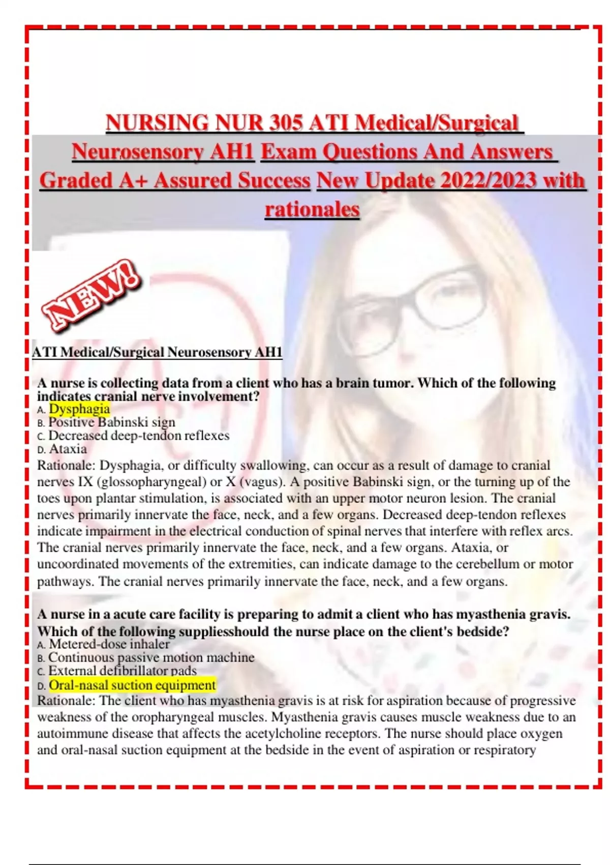 NURSING NUR 305 ATI Medical/Surgical Neurosensory AH1 Exam Questions And Answers Graded A+ Assured Success New Update 2022/2023 with rationales ATI Medical/Surgical Neurosensory AH1 A nurse is collecting data from a client who has a brain tumor. Which of the following indicates cranial nerve involvement? A. Dysphagia B. Positive Babinski sign C. Decreased deep-tendon reflexes D. Ataxia Rationale: Dysphagia, or difficulty swallowing, can occur as a result of damage to cranial nerves IX (glossopharyngeal) or X (vagus). A positive Babinski sign, or the turning up of the toes upon plantar stimulation, is associated with an upper motor neuron lesion. The cranial nerves primarily innervate the face, neck, and a few organs. Decreased deep-tendon reflexes indicate impairment in the electrical conduction of spinal nerves that interfere with reflex arcs. The cranial nerves primarily innervate the face, neck, and a few organs. Ataxia, or uncoordinated movements of the extremities, can indicate damage to the cerebellum or motor pathways. The cranial nerves primarily innervate the face, neck, and a few organs. A nurse in a acute care facility is preparing to admit a client who has myasthenia gravis. Which of the following suppliesshould the nurse place on the client's bedside? A. Metered-dose inhaler B. Continuous passive motion machine C. External defibrillator pads D. Oral-nasal suction equipment Rationale: The client who has myasthenia gravis is at risk for aspiration because of progressive weakness of the oropharyngeal muscles. Myasthenia gravis causes muscle weakness due to an autoimmune disease that affects the acetylcholine receptors. The nurse should place oxygen and oral-nasal suction equipment at the bedside in the event of aspiration or respiratory distress. External defibrillator pads are used for a client who has a cardiac dysrhythmia; however, they are not indicated for aclient who has myasthenia gravis. A continuous passive motion machine is used to provide continuous motion of a joint for a client who is postoperative following joint surgery; however, it is not indicated for a client who has myasthenia gravis. A metered-dose inhaler is used to administer medications for a client who has asthma; however, it is not indicated for a client who has myasthenia gravis. A nurse is collecting data from a client who has Guillain-Barre syndrome. Which of the following findings should the nurse expect? A. Tonic-Clonic seizures B. Report of a severe headache C. Weakness of the lower extremities D. Decreased level of consciousness Rationale: Guillain-Barré syndrome, also called acute inflammatory demyelinating polyneuropathy, is an inflammatory disorder of the peripheral nerves. It is characterized by the rapid onset of ascending weakness and paralysis, starting at the lower extremities, and can advance to the upper extremities. Guillain-Barré syndrome is an inflammatory disorder of the peripheral nerves. Decreased level of consciousness is not a manifestation of Guillain-Barré syndrome. Guillain-Barré syndrome is an inflammatory disorder of the peripheral nerves. Severe headaches are not a manifestation of Guillain-Barré syndrome. Guillain-Barré syndrome is an inflammatory disorder of the peripheral nerves. Tonic-clonic seizures are not a manifestation of Guillain-Barré syndrome. A nurse is collecting data from a client who has a high-thoracic spinal cord injury. The nurse should identify which of thefollowing findings as a manifestation of autonomic dysreflexia? A. Flushing of the lower extremities B. Hypotension C. Tachycardia D. Report of a headache Rationale: Autonomic dysreflexia is a neurologic emergency that can occur in clients who have a cervical or thoracic spinal cord injury above the level of T6. Autonomic dysreflexia can be triggered by a full bladder or distended rectum. Manifestations include a severe, throbbing headache; flushing of the face and neck; bradycardia; and extreme hypertension. Autonomic dysreflexia is a neurologic emergency that occurs in clients who have a cervical or thoracic spinal cord injury above the level of T6. Manifestations include bradycardia but not tachycardia. Autonomic dysreflexia is a neurologic emergency that occurs in clients who have a cervical or thoracic spinal cord injury above the level of T6. Manifes