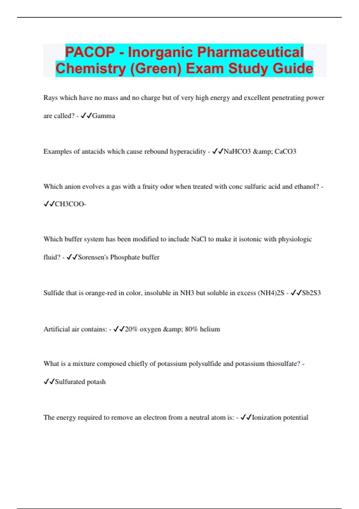 PACOP - Inorganic Pharmaceutical Chemistry (Green) Exam Study Guide | 300 Questions with 100% Correct Answers | Verified | 34 Pages