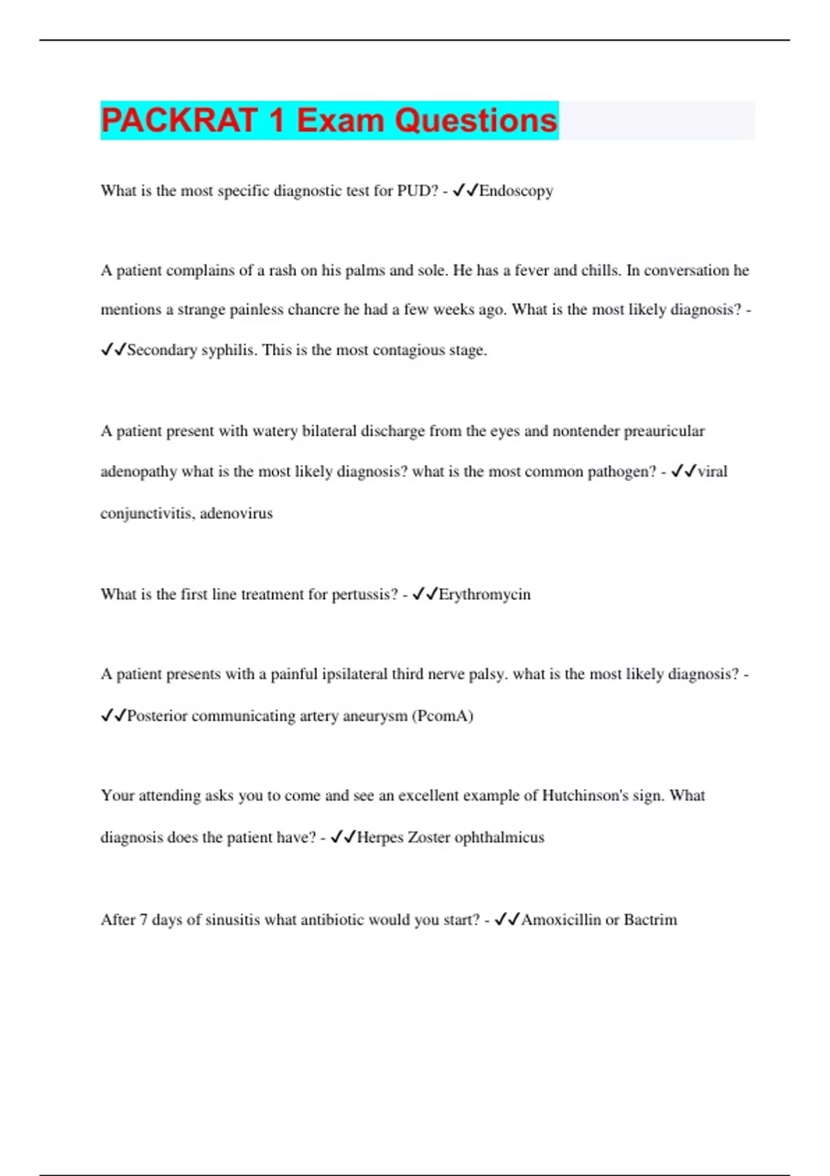 What is the most specific diagnostic test for PUD? - Endoscopy A patient complains of a rash on his palms and sole. He has a fever and chills. In conversation he mentions a strange painless chancre he had a few weeks ago. What is the most likely diagnosis? - Secondary syphilis. This is the most contagious stage. A patient present with watery bilateral discharge from the eyes and nontender preauricular adenopathy what is the most likely diagnosis? what is the most common pathogen? - viral conjunctivitis, adenovirus What is the first line treatment for pertussis? - Erythromycin A patient presents with a painful ipsilateral third nerve palsy. what is the most likely diagnosis? - Posterior communicating artery aneurysm (PcomA) Your attending asks you to come and see an excellent example of Hutchinson's sign. What diagnosis does the patient have? - Herpes Zoster ophthalmicus After 7 days of sinusitis what antibiotic would you start? - Amoxicillin or Bactrim