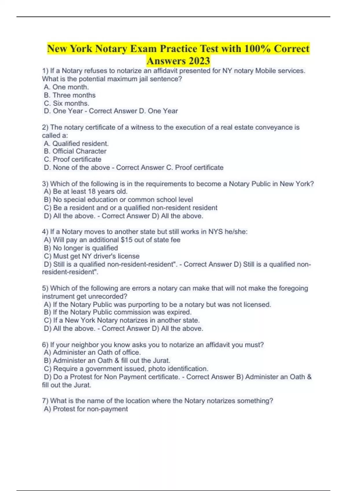 1) If a Notary refuses to notarize an affidavit presented for NY notary Mobile services. What is the potential maximum jail sentence? A. One month. B. Three months C. Six months. D. One Year - Correct Answer D. One Year 2) The notary certificate of a witness to the execution of a real estate conveyance is called a: A. Qualified resident. B. Official Character C. Proof certificate D. None of the above - Correct Answer C. Proof certificate 3) Which of the following is in the requirements to become a Notary Public in New York? A) Be at least 18 years old. B) No special education or common school level C) Be a resident and or a qualified non-resident resident D) All the above. - Correct Answer D) All the above. 4) If a Notary moves to another state but still works in NYS he/she: A) Will pay an additional $15 out of state fee B) No longer is qualified C) Must get NY driver's license D) Still is a qualified non-resident-resident". - Correct Answer D) Still is a qualified non-resident-resident". 5) Which of the following are errors a notary can make that will not make the foregoing instrument get unrecorded? A) If the Notary Public was purporting to be a notary but was not licensed. B) If the Notary Public commission was expired. C) If a New York Notary notarizes in another state. D) All the above. - Correct Answer D) All the above. 6) If your neighbor you know asks you to notarize an affidavit you must? A) Administer an Oath of office. B) Administer an Oath & fill out the Jurat. C) Require a government issued, photo identification. D) Do a Protest for Non Payment certificate. - Correct Answer B) Administer an Oath & fill out the Jurat. 7) What is the name of the location where the Notary notarizes something? A) Protest for non-payment