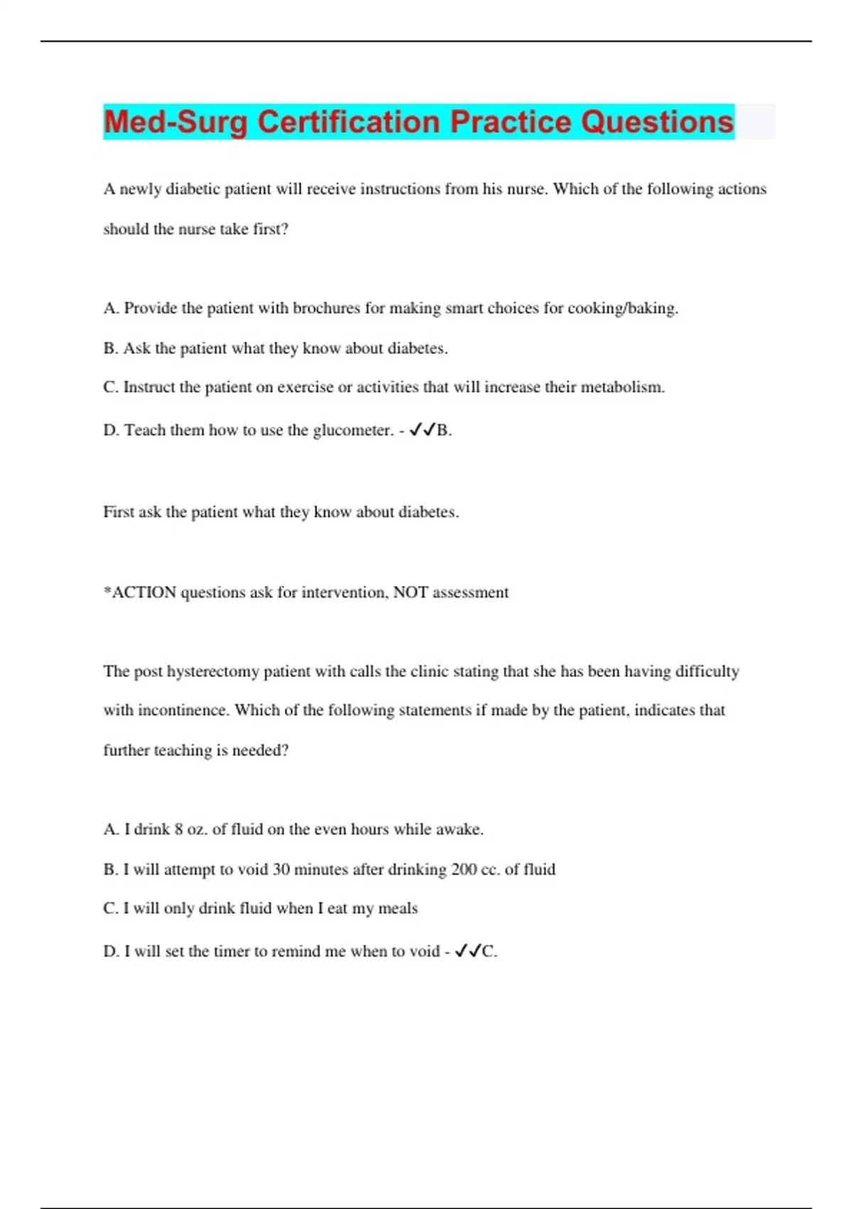 A newly diabetic patient will receive instructions from his nurse. Which of the following actions should the nurse take first? A. Provide the patient with brochures for making smart choices for cooking/baking. B. Ask the patient what they know about diabetes. C. Instruct the patient on exercise or activities that will increase their metabolism. D. Teach them how to use the glucometer. - B. First ask the patient what they know about diabetes. *ACTION questions ask for intervention, NOT assessment The post hysterectomy patient with calls the clinic stating that she has been having difficulty with incontinence. Which of the following statements if made by the patient, indicates that further teaching is needed? A. I drink 8 oz. of fluid on the even hours while awake. B. I will attempt to void 30 minutes after drinking 200 cc. of fluid C. I will only drink fluid when I eat my meals D. I will set the timer to remind me when to void - C