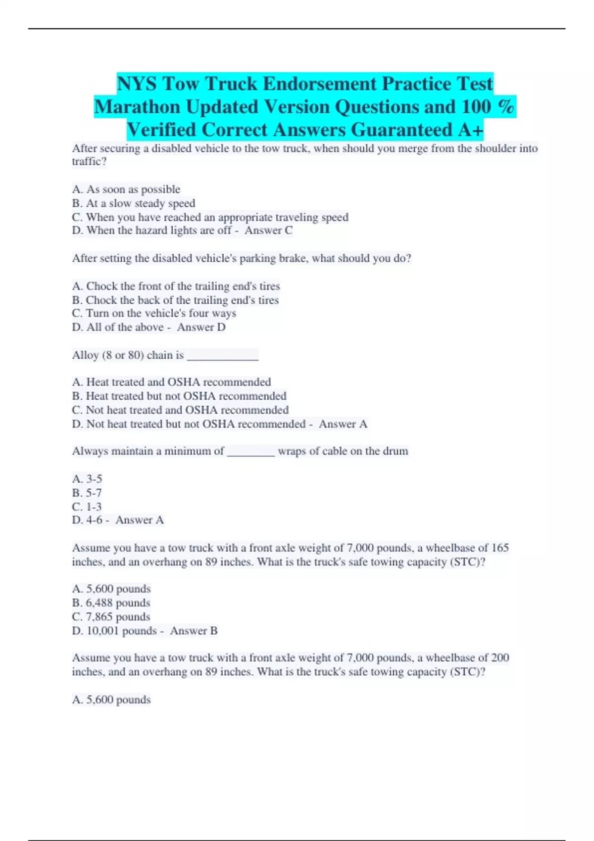 nys tow truck endorsement practice test marathon updated version questions and 100 verified correct answers guaranteed a