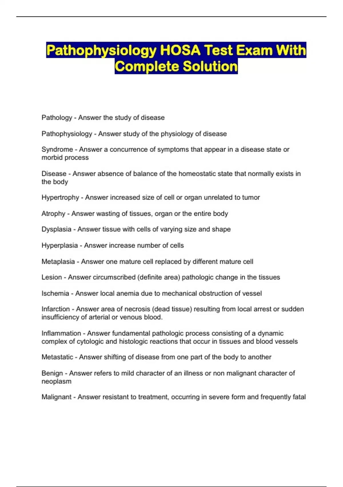 pathophysiology hosa test exam with complete solution