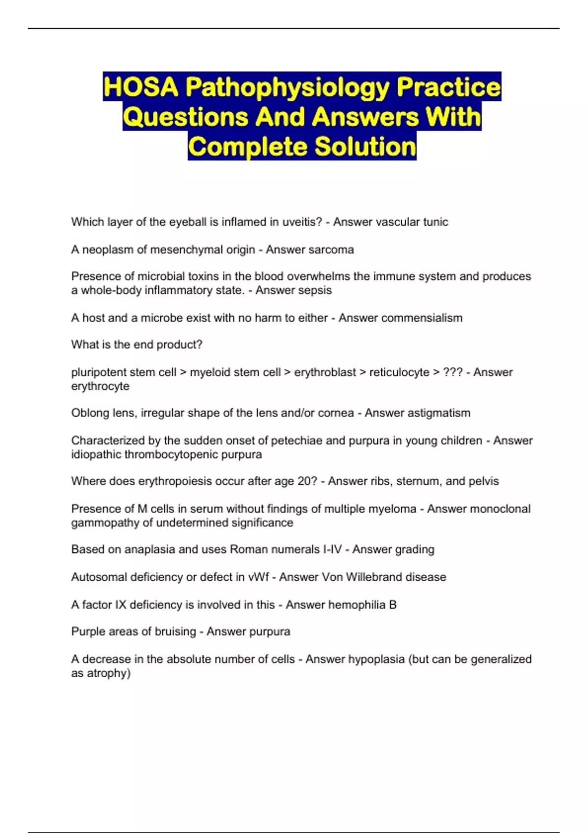 HOSA Pathophysiology Practice Questions And Answers With Complete Solution...
