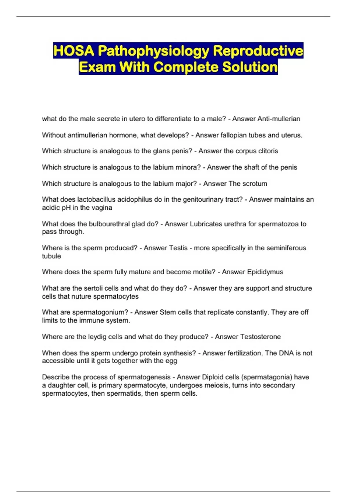 HOSA Pathophysiology Reproductive Exam With Complete Solution...