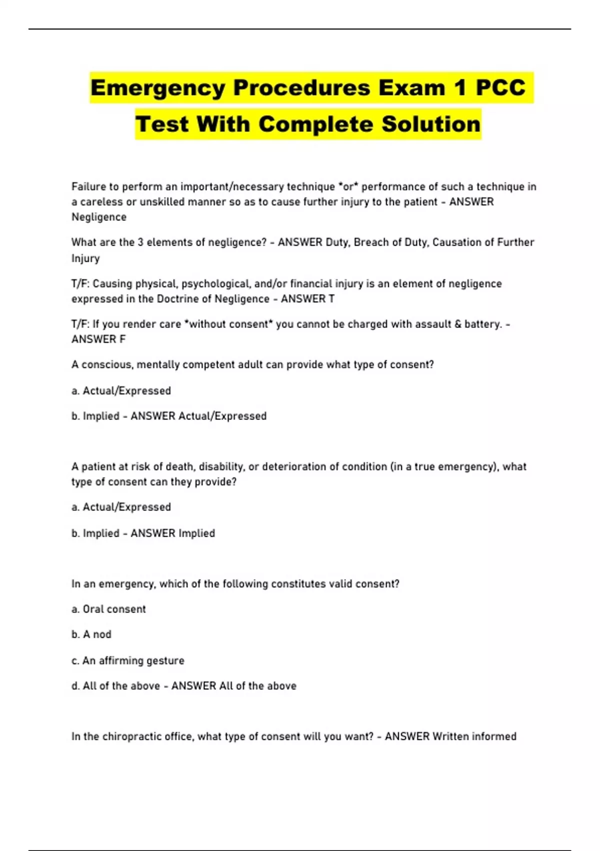 Emergency Procedures Exam 1 PCC Test With Complete Solution...