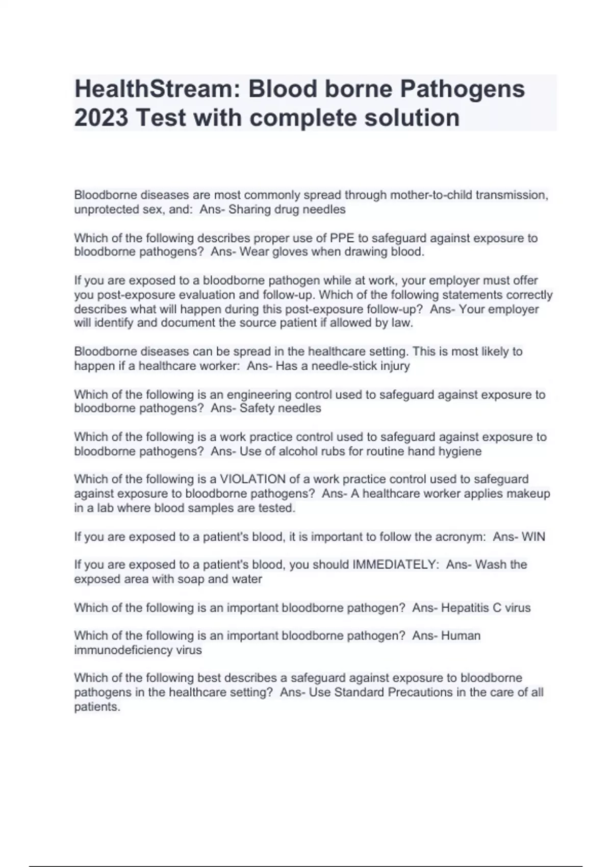 HealthStream: Blood borne Pathogens2023 Test with complete solution. Bloodborne diseases are most commonly spread through mother-to-child transmission, unprotected sex, and: Ans- Sharing drug needles Which of the following describes proper use of PPE to safeguard against exposure to bloodborne pathogens? Ans- Wear gloves when drawing blood. If you are exposed to a bloodborne pathogen while at work, your employer must offer you post-exposure evaluation and follow-up. Which of the following statements correctly describes what will happen during this post-exposure follow-up? Ans- Your employer will identify and document the source patient if allowed by law. Bloodborne diseases can be spread in the healthcare setting. This is most likely to happen if a healthcare worker: Ans- Has a needle-stick injury Which of the following is an engineering control used to safeguard against exposure to bloodborne pathogens? Ans- Safety needles Which of the following is a work practice control used to safeguard against exposure to bloodborne pathogens? Ans- Use of alcohol rubs for routine hand hygiene Which of the following is a VIOLATION of a work practice control used to safeguard against exposure to bloodborne pathogens? Ans- A healthcare worker applies makeup in a lab where blood samples are tested. If you are exposed to a patient's blood, it is important to follow the acronym: Ans- WIN If you are exposed to a patient's blood, you should IMMEDIATELY: Ans- Wash the exposed area with soap and water Which of the following is an important bloodborne pathogen? Ans- Hepatitis C virus Which of the following is an important bloodborne pathogen? Ans- Human immunodeficiency virus.