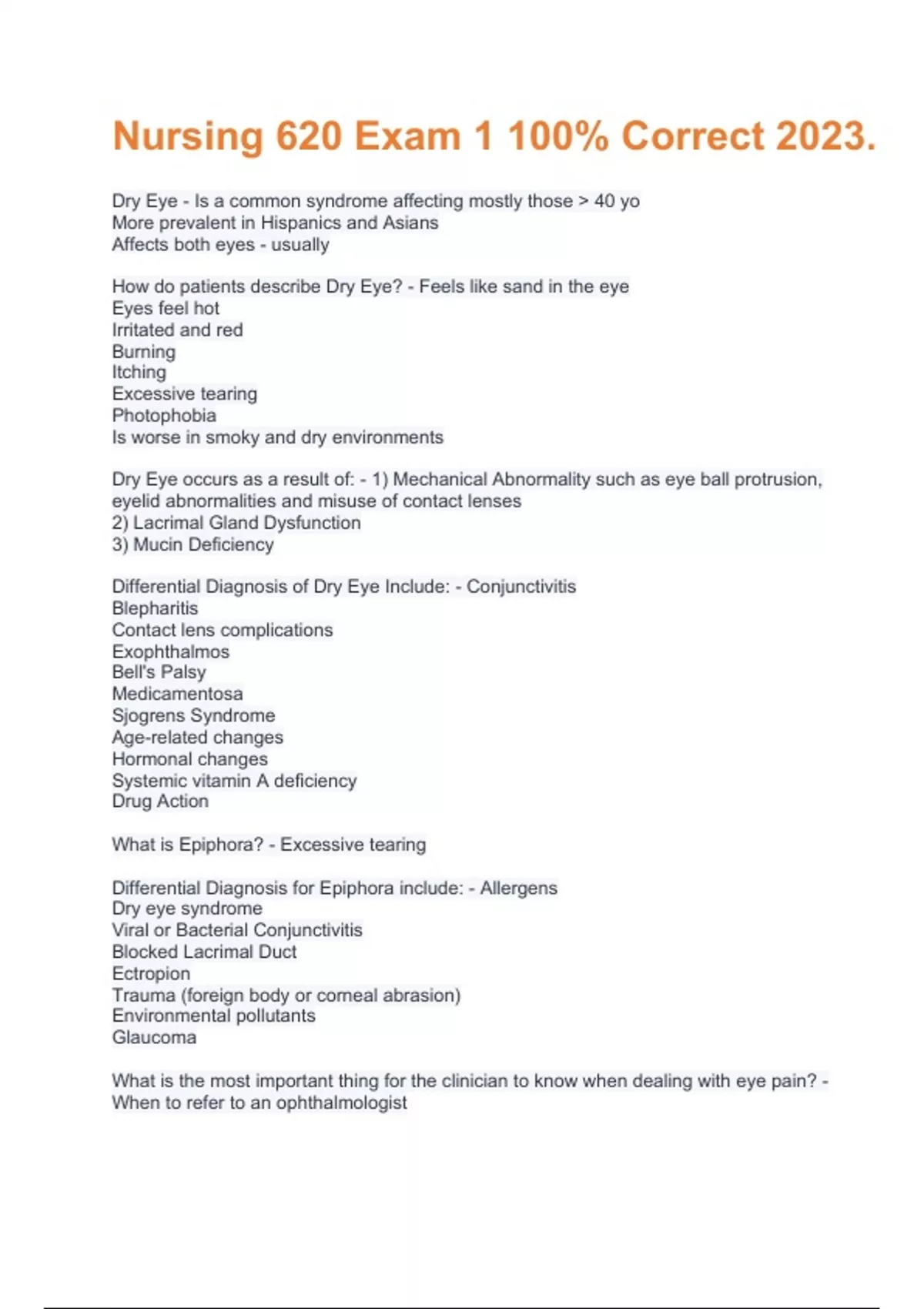 Nursing 620 Exam 1 100% Correct 2023. Dry Eye - Is a common syndrome affecting mostly those > 40 yo More prevalent in Hispanics and Asians Affects both eyes - usually How do patients describe Dry Eye? - Feels like sand in the eye Eyes feel hot Irritated and red Burning Itching Excessive tearing Photophobia Is worse in smoky and dry environments Dry Eye occurs as a result of: - 1) Mechanical Abnormality such as eye ball protrusion, eyelid abnormalities and misuse of contact lenses 2) Lacrimal Gland Dysfunction 3) Mucin Deficiency Differential Diagnosis of Dry Eye Include: - Conjunctivitis Blepharitis Contact lens complications Exophthalmos Bell's Palsy Medicamentosa Sjogrens Syndrome Age-related changes Hormonal changes Systemic vitamin A deficiency Drug Action What is Epiphora? - Excessive tearing Differential Diagnosis for Epiphora include: - Allergens Dry eye syndrome Viral or Bacterial Conjunctivitis Blocked Lacrimal Duct Ectropion Trauma (foreign body or corneal abrasion) Environmental pollutants Glaucoma What is the most important thing for the clinician to know when dealing with eye pain? - When to refer to an ophthalmologist Conditions requiring immediate referral include: - Sudden vision loss Sudden non-traumatic eye pain When the physical exam reveals: corneal abrasion suspected herpes zoster ophthalmicus hazy cornea irregular pupils elevation of fundus on exam papilledema limbal flush muscle paresis Management Issues: steroid therapy no improvement in pt condition after treatment Recommendation #1 to begin empiric therapy is guided by the following three typical presentations. These are made to help distinguish between Acute Bacterial Rhinosinusitis and uncomplicated Viral URI. Once the diagnosis has been made treatment should not be delayed. The three typical presentations are: - 1. Onset with persistent symptoms that last > 10 days and not improving 2. Onset with severe symptoms, characterized by high fever of at least 39 C or 102 F and purulent nasal discharge for at least 3-4 consecutive days at the beginning of the illness. 3. Onset with worsening symptoms characterized by typical viral URI symptoms that appear to improve followed by the sudden onset of worsening symptoms after 5-6 days (double-sickening) What is the typical triad of symptoms for Acute Bacterial Rhinosinusitis in Adults? - 1. Headache 2. Facial Pain 3. Fever ----Onset with persistent symptoms is far more frequent In children with Acute Bacterial Rhinosinusitis, what is the usual presenting condition? - 1. The most common is a cough (80%) 2. Nasal discharge (76%) 3. Fever (63%) Parents of preschoolers often report malodorous breath Differential Diagnosis for Mouth Sores: - • Food or drug allergies • Chemical irritation • Dry mouth • Mechanical or Thermal injury • Infections (fungal, viral or bacterial) • Host Immunosupression • Nutritional deficiency Differential Diagnosis for Hoarseness: - • Infection • Inflammation • Overuse • Vocal cord pathology • Vocal cord paralysis • Muscle atrophy (aging) • Gastroesophageal reflux • Chronic Allergies Differential Diagnosis for Sore Throat: - • Streptococcal pharyngitis • Tonsillitis • HSV • Gonococcus • Candidiasis • Aphthous ulceration • Rhinovirus, adenovirus, Epstein-Barr virus, Coxsackievirus • Mycoplasma What are Common Eye Complaints? - • Redness • Dry eye • Watery or purulent eye discharge • Eye pain • Impaired vision • Ocular itching • Swelling of the eyelid What conditions require immediate referral? - • Severe or sudden vision loss • Eye pain • Corneal ulceration • Trauma • Foreign body • Herpetic Infection of the eye What is Blepharitis? - • Is an inflammation of the eyelids and eyelid margins What forms of Blepharitis are there? - • Nonulcerative form associated with seborrhea • Ulcerative Describe Non-ulcerative Blepharitis: - • Tends to affect people with psoriasis, seborrhea, eczema, allergies, and lice infestations • Contributing factors: exposure to chemical or environmental irritants, use of eye makeup and contact lenses • Non-Ulcerative Blephritis may present with scales along the lid margins that are easily removed What are contributing factors to Non-Ulcerative Blepharitis? - • Exposure to chemical or environmental irritants • Use of eye makeup • Contact lenses Describe Ulcerative Blepharitis: - • Involves the lash follicle and the meibomian glands of the eyelid • Lashes become thin and break easily • Ulcerative Blephritis may have pustules at the base of the hair follicles that may crust and bleed. What is the clinical presentation of Blephritis (both forms)? - Subjective: • Itching and burning • Foreign body sensation • Sensitivity to bright lights • Excessive tearing • May be unilateral or bilateral Objective: • Lid margins are edematous and erythematous in both cases • Palpate for preauricular lymphadenopathy Diagnostic Tests for Blephritis: - • Always check visual acuity • For any discharge a culture with sensitivity can be considered When should you refer a patient with Blephritis? - • Visual Loss • Moderate to severe pain • Chronic redness of the eye • Corneal involvement • Recurrent blephritis • Failure to respond to treatment within one month Differential Diagnosis for Blephritis: - • Sebaceous cell carcinoma (23% mortality rate) • Squamous cell carcinoma • Basal cell carcinoma Patient Education for Blepharitis: - • Cleanliness - wash hands • Hypoallergenic soaps • Cautious use with contact lenses • Avoid eye makeup.