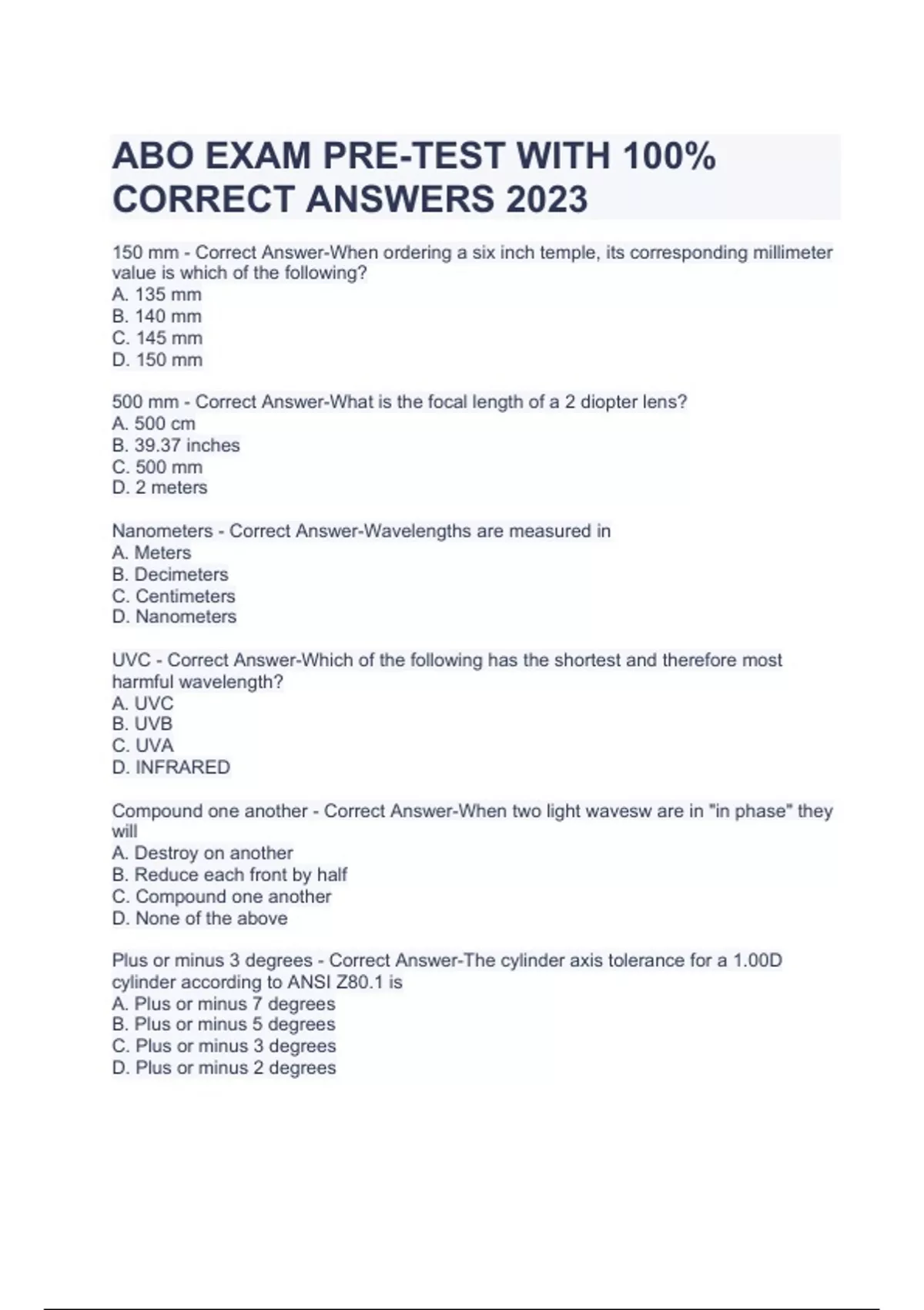 ABO EXAM PRE-TEST WITH 100% CORRECT ANSWERS 2023. 150 mm - Correct Answer-When ordering a six inch temple, its corresponding millimeter value is which of the following? A. 135 mm B. 140 mm C. 145 mm D. 150 mm 500 mm - Correct Answer-What is the focal length of a 2 diopter lens? A. 500 cm B. 39.37 inches C. 500 mm D. 2 meters Nanometers - Correct Answer-Wavelengths are measured in A. Meters B. Decimeters C. Centimeters D. Nanometers UVC - Correct Answer-Which of the following has the shortest and therefore most harmful wavelength? A. UVC B. UVB C. UVA D. INFRARED Compound one another - Correct Answer-When two light wavesw are in "in phase" they will A. Destroy on another B. Reduce each front by half C. Compound one another D. None of the above Plus or minus 3 degrees - Correct Answer-The cylinder axis tolerance for a 1.00D cylinder according to ANSI Z80.1 is A. Plus or minus 7 degrees B. Plus or minus 5 degrees C. Plus or minus 3 degrees D. Plus or minus 2 degrees Thicker temporally - Correct Answer-A plus lens decentered "out" will result in a finished lens which is A. Balanced B. Thicker temporally C. Thicker nasally D. Uniform in edge thickness Thicker nasally - Correct Answer-A minus lens decentered "out" will result in a finished lens which is A. Balanced B. Thicker temporally C. Thicker nasally D. Uniform in edge thickness 8% - Correct Answer-An uncoated normal plastic lens will reflect approximately ______% of light. A. 2% B. 4% C. 8% D. 12% Biconcave - Correct Answer-A lens having a minus curve on both front and back is called A. Toric B. Meniscus C. Biconvex D. Biconcave 50% - Correct Answer-Give the RX +1.00 +1.00 x 45, how much of the +1.00 cylinder is in the effect at axis 90? A. 100% B. 70% C. 50% D. 0 .
