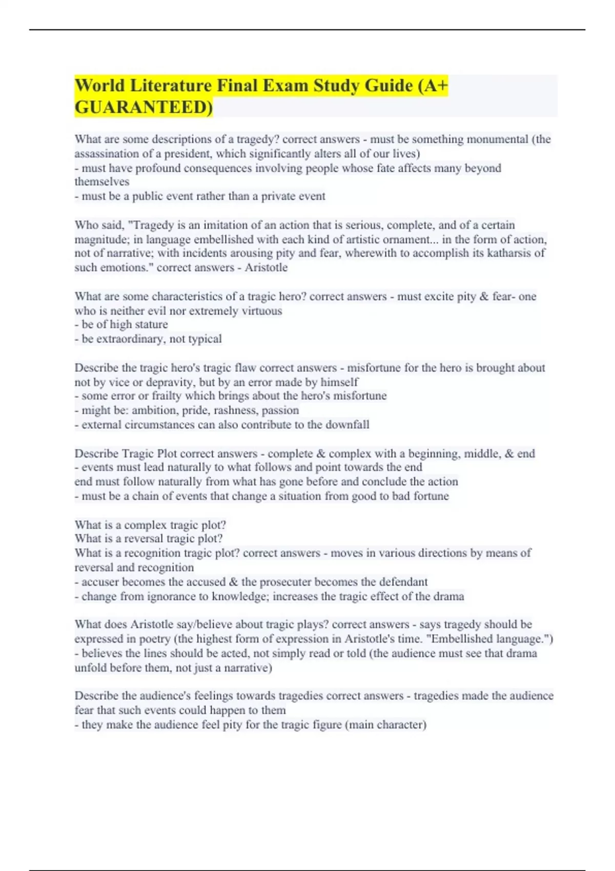 What are some descriptions of a tragedy? correct answers - must be something monumental (the assassination of a president, which significantly alters all of our lives) - must have profound consequences involving people whose fate affects many beyond themselves - must be a public event rather than a private event Who said, "Tragedy is an imitation of an action that is serious, complete, and of a certain magnitude; in language embellished with each kind of artistic ornament... in the form of action, not of narrative; with incidents arousing pity and fear, wherewith to accomplish its katharsis of such emotions." correct answers - Aristotle What are some characteristics of a tragic hero? correct answers - must excite pity & fear- one who is neither evil nor extremely virtuous - be of high stature - be extraordinary, not typical Describe the tragic hero's tragic flaw correct answers - misfortune for the hero is brought about not by vice or depravity, but by an error made by himself - some error or frailty which brings about the hero's misfortune - might be: ambition, pride, rashness, passion - external circumstances can also contribute to the downfall Describe Tragic Plot correct answers - complete & complex with a beginning, middle, & end - events must lead naturally to what follows and point towards the end end must follow naturally from what has gone before and conclude the action - must be a chain of events that change a situation from good to bad fortune What is a complex tragic plot? What is a reversal tragic plot? What is a recognition tragic plot? correct answers - moves in various directions by means of reversal and recognition - accuser becomes the accused & the prosecuter becomes the defendant - change from ignorance to knowledge; increases the tragic effect of the drama What does Aristotle say/believe about tragic plays? correct answers - says tragedy should be expressed in poetry (the highest form of expression in Aristotle's time. "Embellished language.") - believes the lines should be acted, not simply read or told (the audience must see that drama unfold before them, not just a narrative) Describe the audience's feelings towards tragedies correct answers - tragedies made the audience fear that such events could happen to them - they make the audience feel pity for the tragic figure (main character)