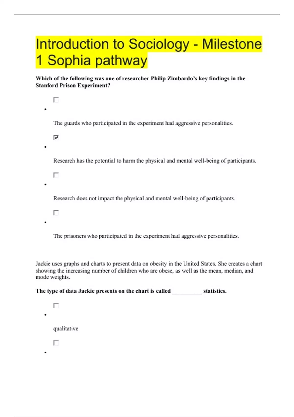 Introduction to Sociology - Milestone 1 Sophia pathway Questions and Answers 2023