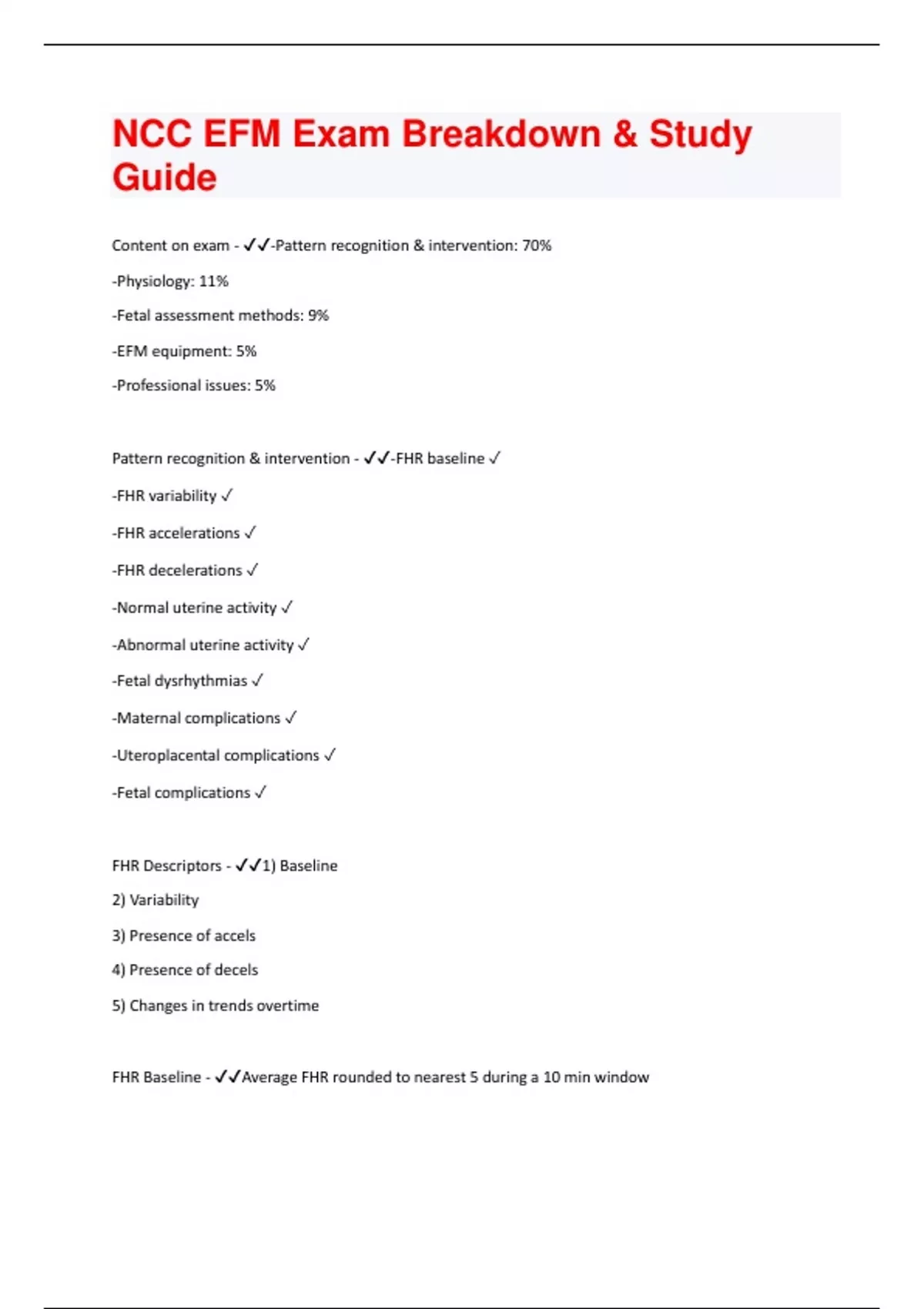 Content on exam - -Pattern recognition & intervention: 70% -Physiology: 11% -Fetal assessment methods: 9% -EFM equipment: 5% -Professional issues: 5% Pattern recognition & intervention - -FHR baseline -FHR variability -FHR accelerations -FHR decelerations -Normal uterine activity -Abnormal uterine activity -Fetal dysrhythmias -Maternal complications -Uteroplacental complications -Fetal complications FHR Descriptors - 1) Baseline 2) Variability 3) Presence of accels 4) Presence of decels 5) Changes in trends overtime FHR Baseline - Average FHR rounded to nearest 5 during a 10 min window