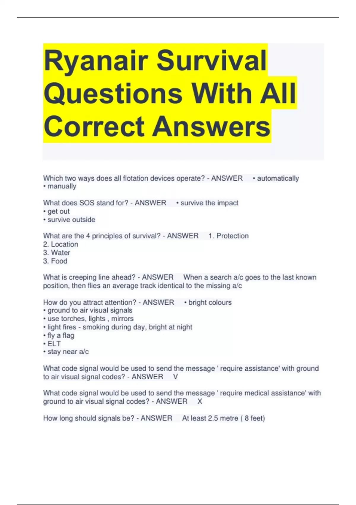 Ryanair Survival Questions With All Correct Answers Which two ways does all flotation devices operate? - ANSWER • automatically • manually What does SOS stand for? - ANSWER • survive the impact • get out • survive outside What are the 4 principles of survival? - ANSWER 1. Protection 2. Location 3. Water 3. Food What is creeping line ahead? - ANSWER When a search a/c goes to the last known position, then flies an average track identical to the missing a/c How do you attract attention? - ANSWER • bright colours • ground to air visual signals • use torches, lights , mirrors • light fires - smoking during day, bright at night • fly a flag • ELT • stay near a/c What code signal would be used to send the message ' require assistance' with ground to air visual signal codes? - ANSWER V What code signal would be used to send the message ' require medical assistance' with ground to air visual signal codes? - ANSWER X