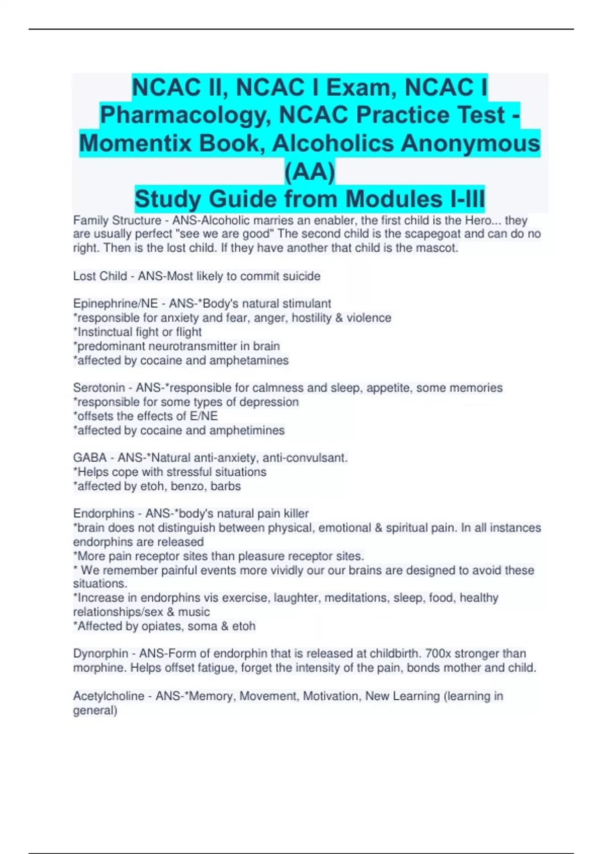 NCAC II, NCAC I Exam, NCAC I Pharmacology, NCAC Practice Test - Momentix Book, Alcoholics Anonymous (AA) Study Guide from Modules I-III Family Structure - ANS-Alcoholic marries an enabler, the first child is the Hero... they are usually perfect "see we are good" The second child is the scapegoat and can do no right. Then is the lost child. If they have another that child is the mascot. Lost Child - ANS-Most likely to commit suicide Epinephrine/NE - ANS-*Body's natural stimulant *responsible for anxiety and fear, anger, hostility & violence *Instinctual fight or flight *predominant neurotransmitter in brain *affected by cocaine and amphetamines Serotonin - ANS-*responsible for calmness and sleep, appetite, some memories *responsible for some types of depression *offsets the effects of E/NE *affected by cocaine and amphetimines GABA - ANS-*Natural anti-anxiety, anti-convulsant. *Helps cope with stressful situations *affected by etoh, benzo, barbs Endorphins - ANS-*body's natural pain killer *brain does not distinguish between physical, emotional & spiritual pain. In all instances endorphins are released *More pain receptor sites than pleasure receptor sites. * We remember painful events more vividly our our brains are designed to avoid these situations. *Increase in endorphins vis exercise, laughter, meditations, sleep, food, healthy relationships/sex & music *Affected by opiates, soma & etoh Dynorphin - ANS-Form of endorphin that is released at childbirth. 700x stronger than morphine. Helps offset fatigue, forget the intensity of the pain, bonds mother and child. Acetylcholine - ANS-*Memory, Movement, Motivation, New Learning (learning in general) *Depletion results in alzheimers symptoms *Affected by THC Anandamide - ANS-Similar to aceylcholine. *Memory, New Learning specific, calmness, controlling movement *Affected by THC Glutamate - ANS-*Memory *Duck tape of the brain... regenerates and mimics other neurotransmitters to fill the gaps for the ones that have been damaged *Anti Convulsant Dopamine - ANS-*Pleasure (located in the pleasure pathway) *every drug mimics or releases dopamine *cocaine and other stimulates actually block the re-uptake of dopamine so that it increases the dopamine response *etoh & opiates enhance dopamine release that would otherwise block/inhibit dopamine secreting neurons. *Schizophrenia is noted to be too much dopamine in the brain *too few dopamines mimic parkinsons *Affected by all drugs but mostly meth. Methamphetimine high - ANS-most resembles schizophrenia Meth withdrawal - ANS-mimics parkinsons Meth results in the release of so much dopamine - ANS-that it can take YEARS for the person to learn to feel pleasure again. PIP (phenylimide Indoleamine Pyrimidine) - ANS-*responsible for feeling of true care/love *affects various parts of the brain at one time *decreases after about 3 years bc the brain cannot sustain the same level of intensity. The passion sorta burns out. *PIP changes to endorphins after decades in a relationship Adverse Effects of substances are usually seen - ANS-in those with ADHD or Bipolar w Korsacoff Wenicke Syndrome - ANS-After prolonged alcohol abuse, the person is unable to walk steadily (like walking in sand), eyes twitch back and forth State Dependent Learning - ANS-Learn when high on THC, does not remember when sober, does remember when under the influence of THC later. Continues...