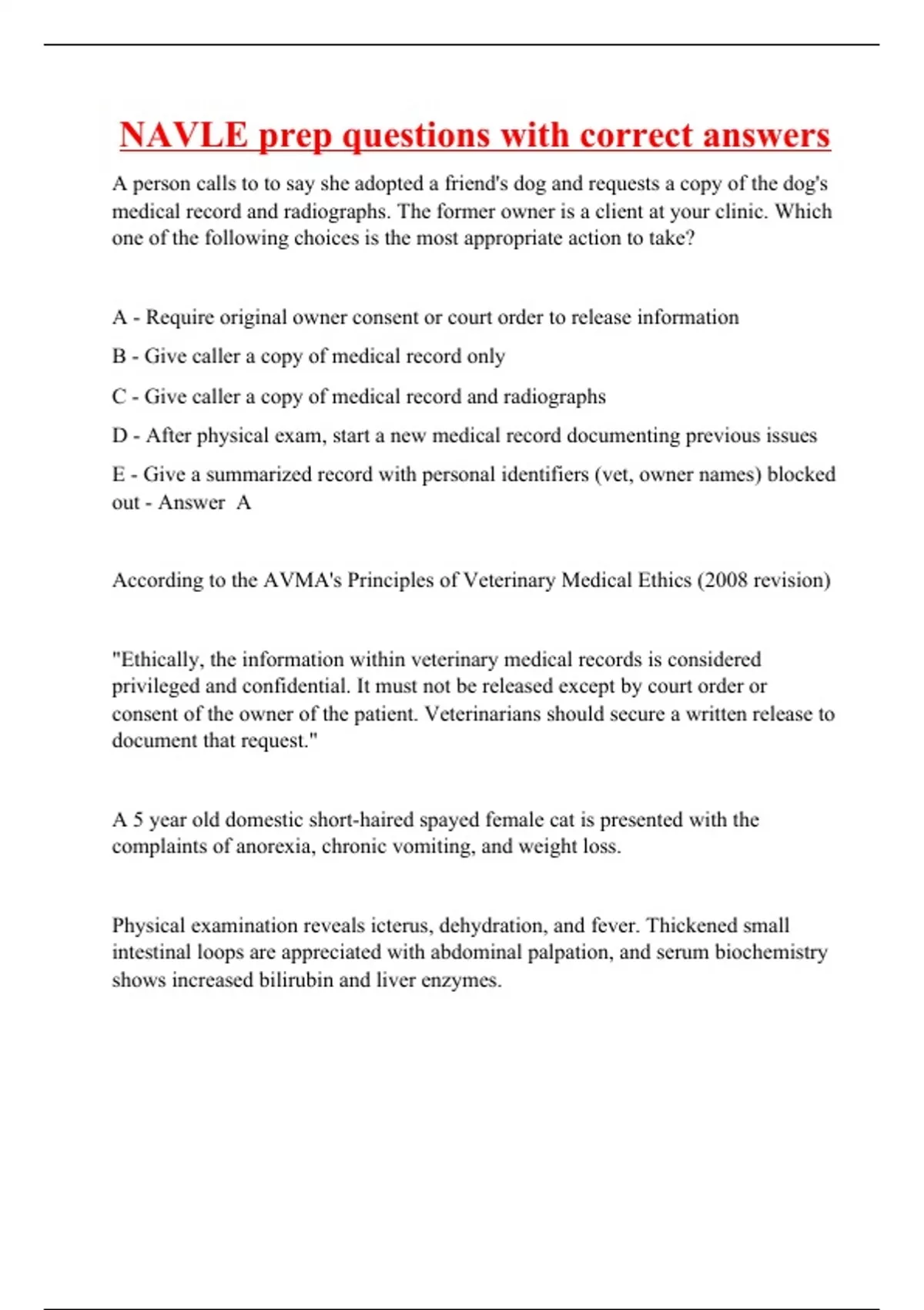 A person calls to to say she adopted a friend's dog and requests a copy of the dog's medical record and radiographs. The former owner is a client at your clinic. Which one of the following choices is the most appropriate action to take? A - Require original owner consent or court order to release information B - Give caller a copy of medical record only C - Give caller a copy of medical record and radiographs D - After physical exam, start a new medical record documenting previous issues E - Give a summarized record with personal identifiers (vet, owner names) blocked out - Answer A According to the AVMA's Principles of Veterinary Medical Ethics (2008 revision) "Ethically, the information within veterinary medical records is considered privileged and confidential. It must not be released except by court order or consent of the owner of the patient. Veterinarians should secure a written release to document that request." A 5 year old domestic short-haired spayed female cat is presented with the complaints of anorexia, chronic vomiting, and weight loss. Physical examination reveals icterus, dehydration, and fever. Thickened small intestinal loops are appreciated with abdominal palpation, and serum biochemistry shows increased bilirubin and liver enzymes.