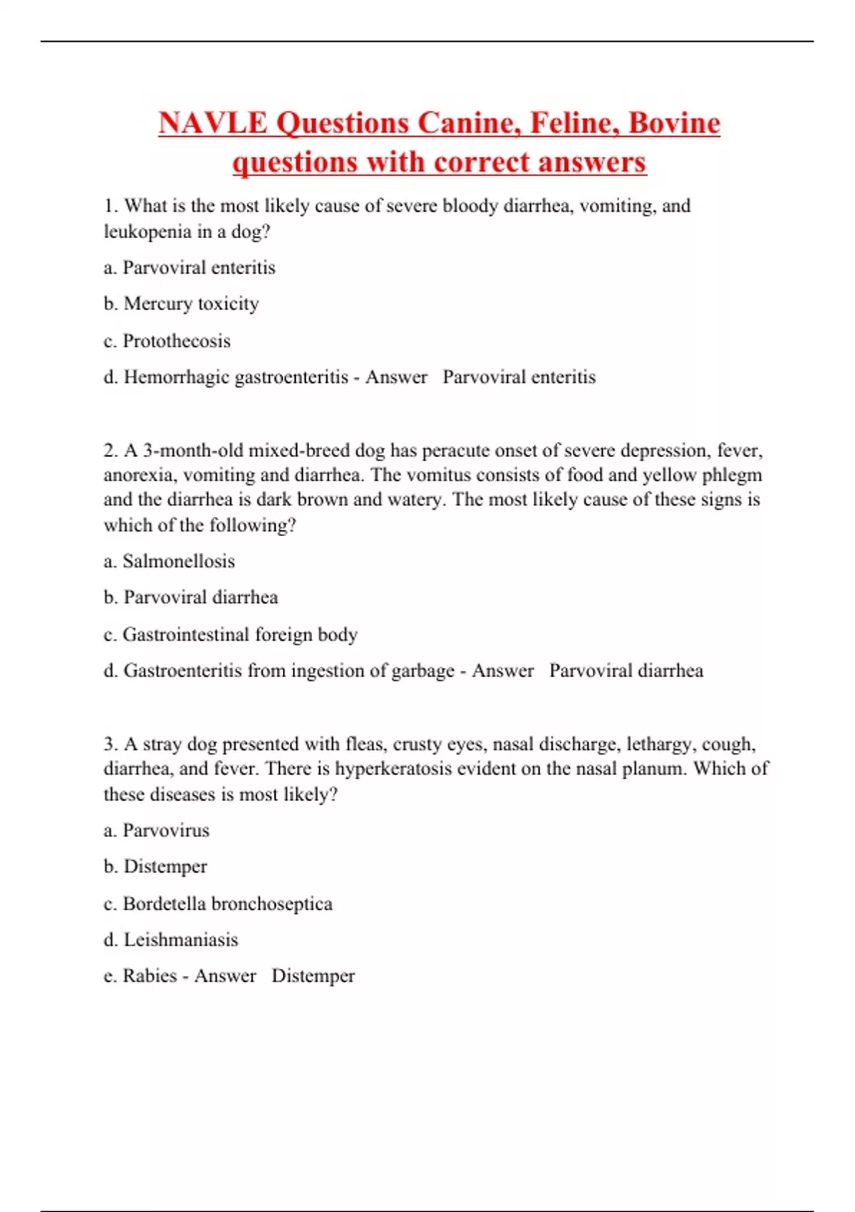 1. What is the most likely cause of severe bloody diarrhea, vomiting, and leukopenia in a dog? a. Parvoviral enteritis b. Mercury toxicity c. Protothecosis d. Hemorrhagic gastroenteritis - Answer Parvoviral enteritis 2. A 3-month-old mixed-breed dog has peracute onset of severe depression, fever, anorexia, vomiting and diarrhea. The vomitus consists of food and yellow phlegm and the diarrhea is dark brown and watery. The most likely cause of these signs is which of the following? a. Salmonellosis b. Parvoviral diarrhea c. Gastrointestinal foreign body d. Gastroenteritis from ingestion of garbage - Answer Parvoviral diarrhea 3. A stray dog presented with fleas, crusty eyes, nasal discharge, lethargy, cough, diarrhea, and fever. There is hyperkeratosis evident on the nasal planum. Which of these diseases is most likely? a. Parvovirus b. Distemper c. Bordetella bronchoseptica d. Leishmaniasis e. Rabies - Answer Distemper