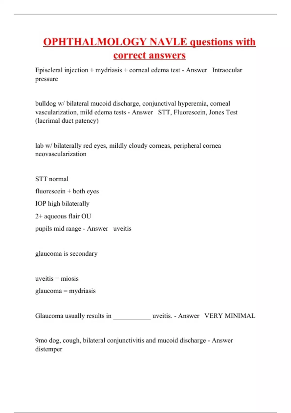 Episcleral injection + mydriasis + corneal edema test - Answer Intraocular pressure bulldog w/ bilateral mucoid discharge, conjunctival hyperemia, corneal vascularization, mild edema tests - Answer STT, Fluorescein, Jones Test (lacrimal duct patency) lab w/ bilaterally red eyes, mildly cloudy corneas, peripheral cornea neovascularization STT normal fluorescein + both eyes IOP high bilaterally 2+ aqueous flair OU pupils mid range - Answer uveitis glaucoma is secondary uveitis = miosis glaucoma = mydriasis Glaucoma usually results in ___________ uveitis. - Answer VERY MINIMAL 9mo dog, cough, bilateral conjunctivitis and mucoid discharge - Answer distemper