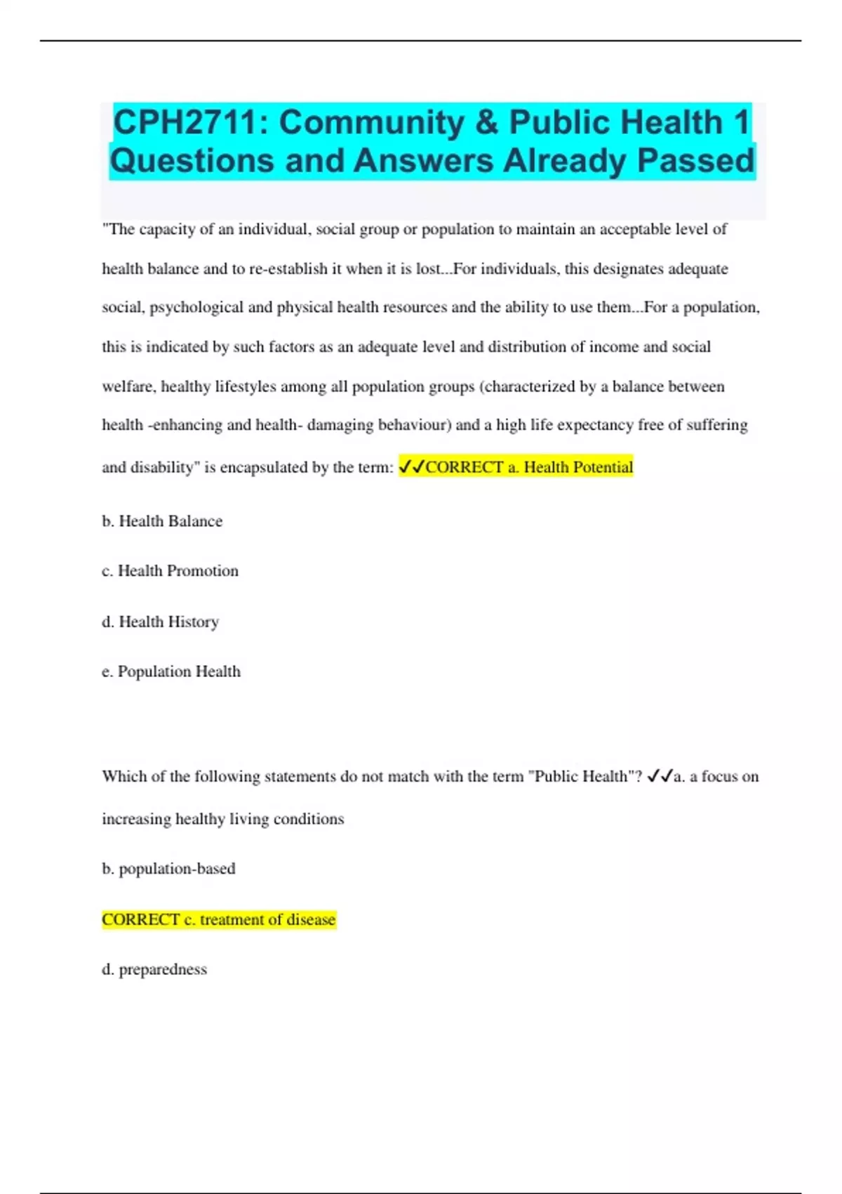 CPH2711: Community & Public Health 1 Questions and Answers Already Passed "The capacity of an individual, social group or population to maintain an acceptable level of health balance and to re-establish it when it is lost...For individuals, this designates adequate social, psychological and physical health resources and the ability to use them...For a population, this is indicated by such factors as an adequate level and distribution of income and social welfare, healthy lifestyles among all population groups (characterized by a balance between health -enhancing and health- damaging behaviour) and a high life expectancy free of suffering and disability" is encapsulated by the term: CORRECT a. Health Potential b. Health Balance c. Health Promotion d. Health History e. Population Health Which of the following statements do not match with the term "Public Health"? a. a focus on increasing healthy living conditions b. population-based CORRECT c. treatment of disease d. preparedness e. all of the above The term "Health inequality" refers to: a. The differences in health outcomes between countries b. The differences in health outcomes within countries c. The change in health status related to the use of specific risk factors (e.g. smoking) CORRECT d. Both A & B e. Both B & C True or False: The concept of 'Quality of Life' includes feelings people express in areas such as standard of living, income, housing, neighbourhood and health. True According to the WHO, Health is: CORRECT a. Health is a state of complete physical, mental and social well-being and not merely the absence of disease or infirmity. Correct b. The conditions under which people are born, grow, live, work, and age. c. The absence of disease or infirmity. d. The opposite of illness. e. None of the Above Measures of psychological wellbeing tend to tap two components: CORRECT a. Affective wellbeing (feeling states) and cognitive or mental functioning Correct b. Feeling healthy and feeling ill c. Medicine and Public Health d. All of the above e. None of the above 'Health in a vacuum' as an understanding of the concept of health refers to: a. Morbidity & Disability CORRECT b. The absence of disease only Correct c. Having health d. Self-perceived Health e. All of the Above What kind of information are more recent (within the past few decades) Health Information Systems interested in? a. Morbidity & Disability b. Use of Health Services c. Cardiovascular and lifestyle risk factors d. self-perceived Health CORRECT e. All of the Above True or False: Climate change affects human health in a number of ways including: Increased thermal stress and air pollutants associated with an increase in the number of heat waves, increased frequency of extreme events and weather disasters, increased incidence of gastrointestinal disease associated with food and water related diseases, a change in the distribution of vector species, and rising water levels. True True or False: Public Health is primarily the acute response to a disease at an individual level. False True or False: The term global public health recognizes that, as a result of globalization, forces that affect public health can and do come from outside state boundaries and that responding to public health issues now requires attention to cross-border health risks, including access to dangerous products and environmental change. True Core components of Social capital are: a. Social ties b. Community ties c. Natural environment CORRECT d. Both A and B e. All of the above Which of the following phrases do not match with the term "Public Health"? a. a focus on increasing healthy living conditions b. population-based CORRECT c. treatment of disease d. preparedness e. all of the above True or False: Good health includes reducing levels of educational failure, reducing insecurity and unemployment, and improving housing standards. True True or False: The social determinants are based on the choices that we make, therefore any solution to issues arising from the social determinants must be built on education and behaviour change. False True or False: In the effects of the social gradient are not merely confirmed to the poor. For instance, among middle-class office workers, the lowest ranking workers will, on average, suffer more disease and earlier death than higher-ranking o