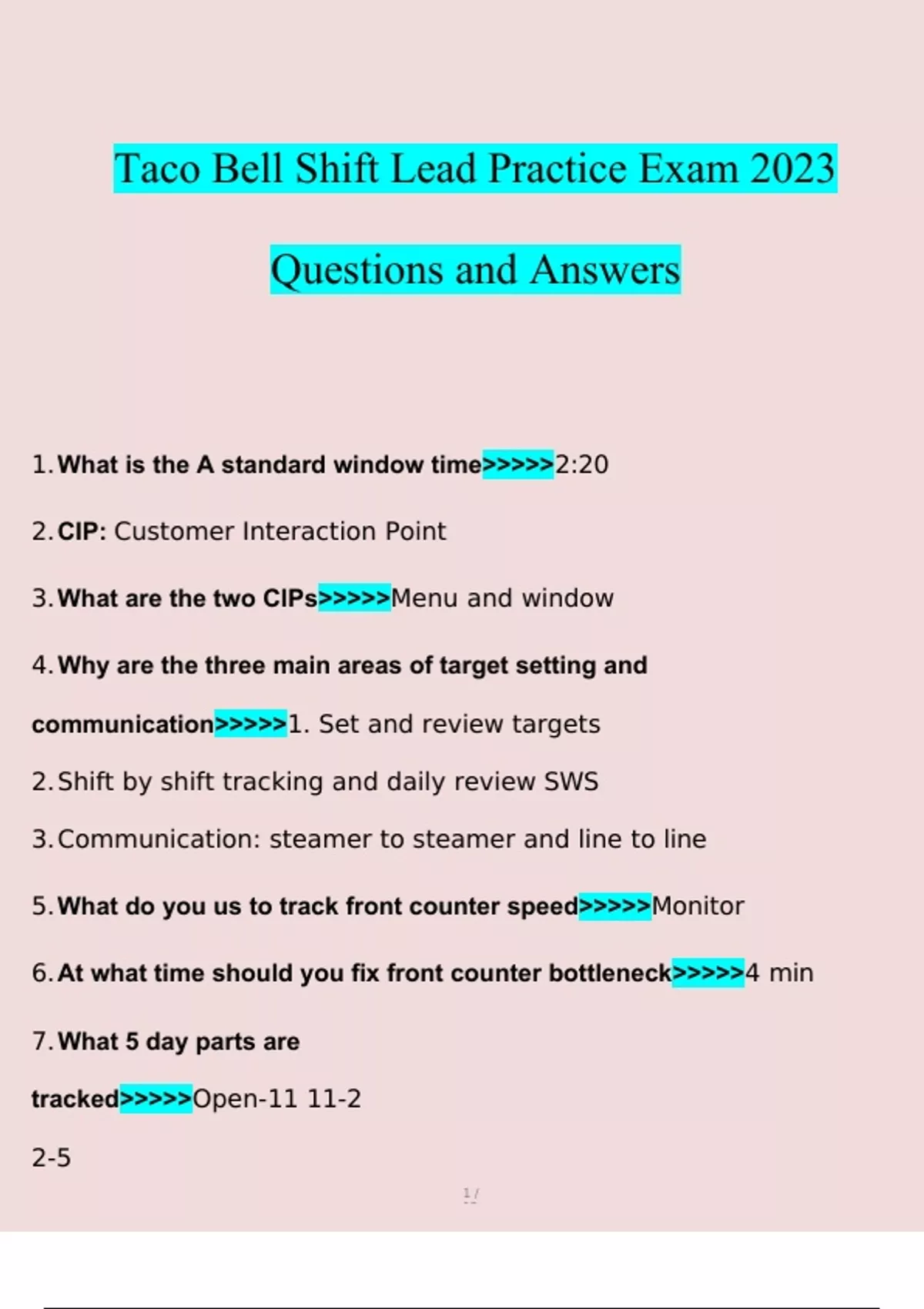 taco bell shift lead practice exam 2023 questions verified with 100 correct answers