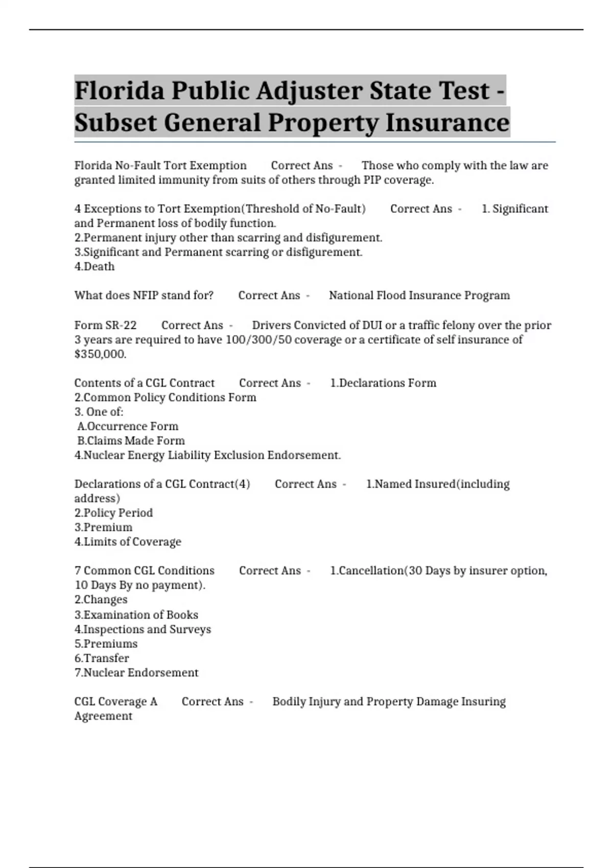 Florida Public Adjuster State Test - Subset General Property Insurance